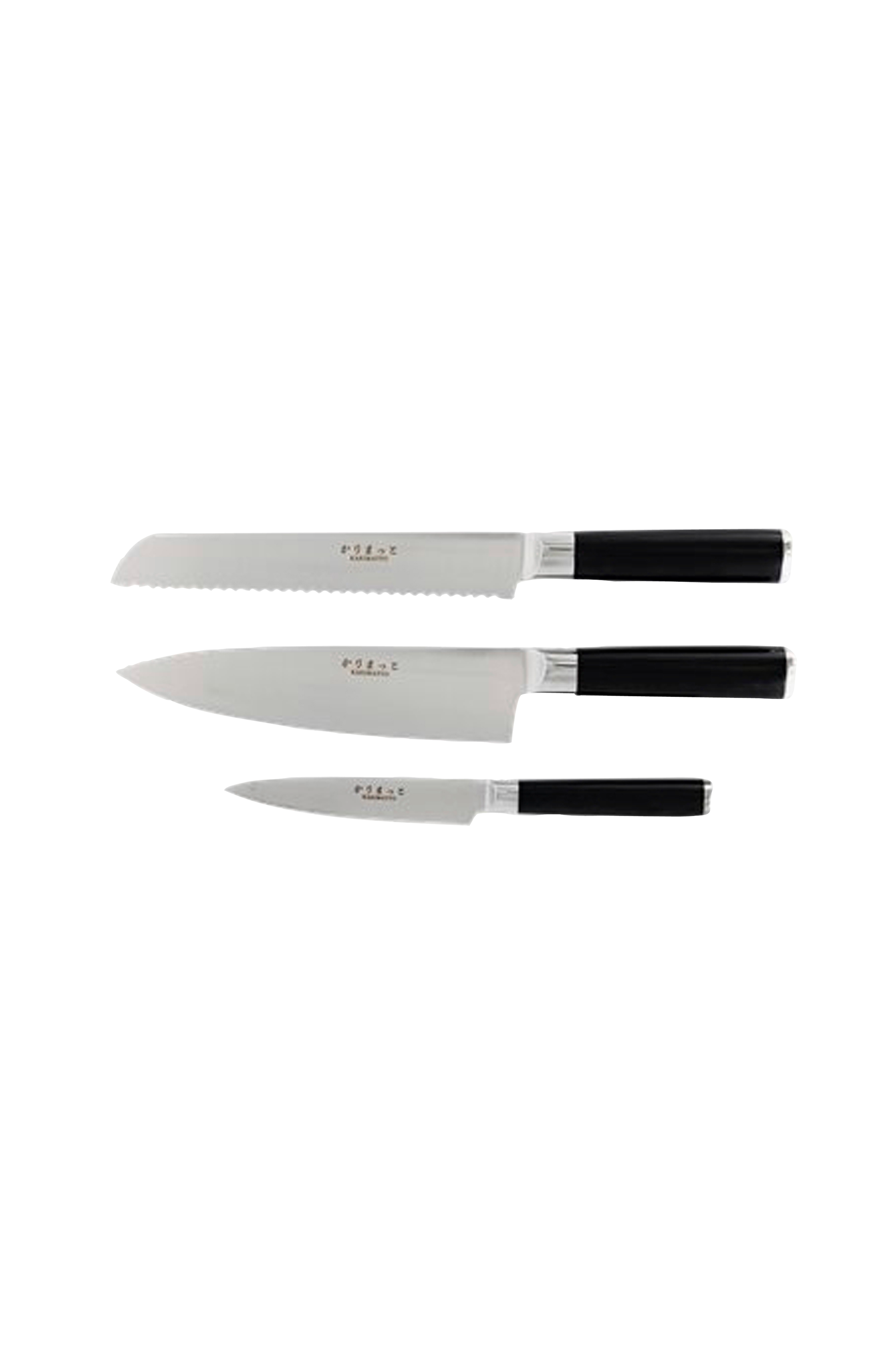 Med karimatto får du moderne knive i et klassisk twist, som har et fantastisk knivstål 5cr15mov, der består af en kombination af molybdæn/vanadium. Stålet har en høj hårdhedsgrad (56 ± 1 på Rockwell-skalaen), hvilket betyder, at eggen både er let at slibe og holder sig skarp i lang tid. Behagelige håndtag med en fantastisk finish i kompositmateriale giver lang levetid. Bemærk, hvor godt de ergonomiske håndtag ligger i hånden for både højre- og venstrehåndede. Det professionelt designede håndtag er formet til at blive arbejdet med i timevis. 12 cm universalkniv fra karimatto, som er fremragende til at skrælle og skære grøntsager og frugt. 20 cm kokkekniv fra karimatto, der er fremragende som allroundkniv til at skære både kød og grøntsager. 20 cm brødkniv fra karimatto med bølget savtakket kant, der er fremragende til at skære brød både med og uden hård skorpe. Ergonomisk håndtag, der ligger godt i hånden og er skånsomt mod håndleddet. Kniven er lavet af rustfrit stål 5Cr...