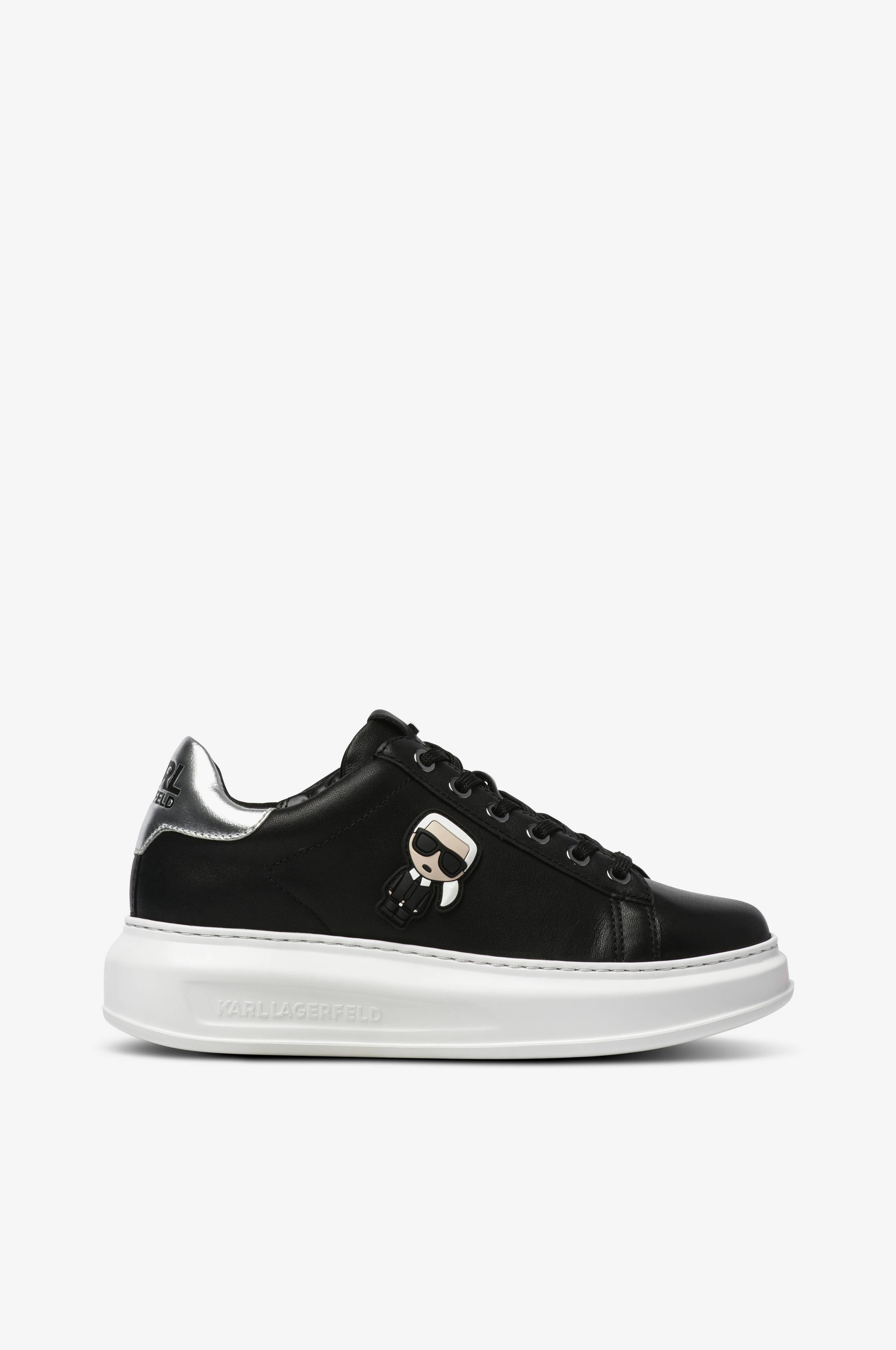 Sneakers Kapri Karl Iconic Lo Lace fra Karl Lagerfeld i glat skind. Hælkappe i mat sølvfarve med printet logo. Applikation med Lagerfelds klassiske portræt på ydersiden og logobogstaver i metal på pløsen. Udtagelig indersål. Sålhøjde ca. 3,5 cm.