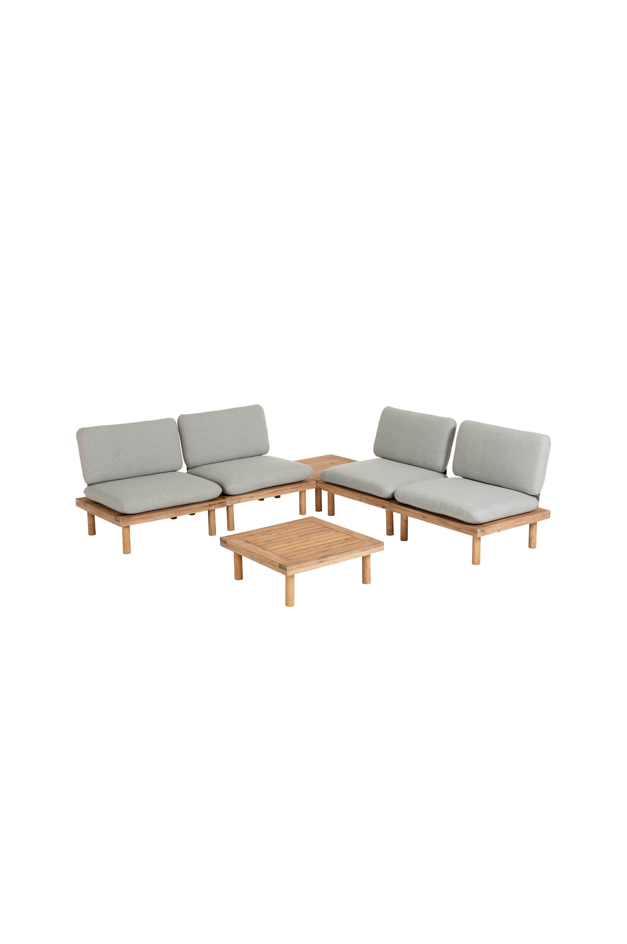 Sofagruppe med bord af akacietræ. Du kan sætte gruppen sammen som det passer dig. Mål Bord, 70x70 højde 27 cm. Lænestol 70x70, højde 77 cm. Hynder medfølger. Leveres usamlet.