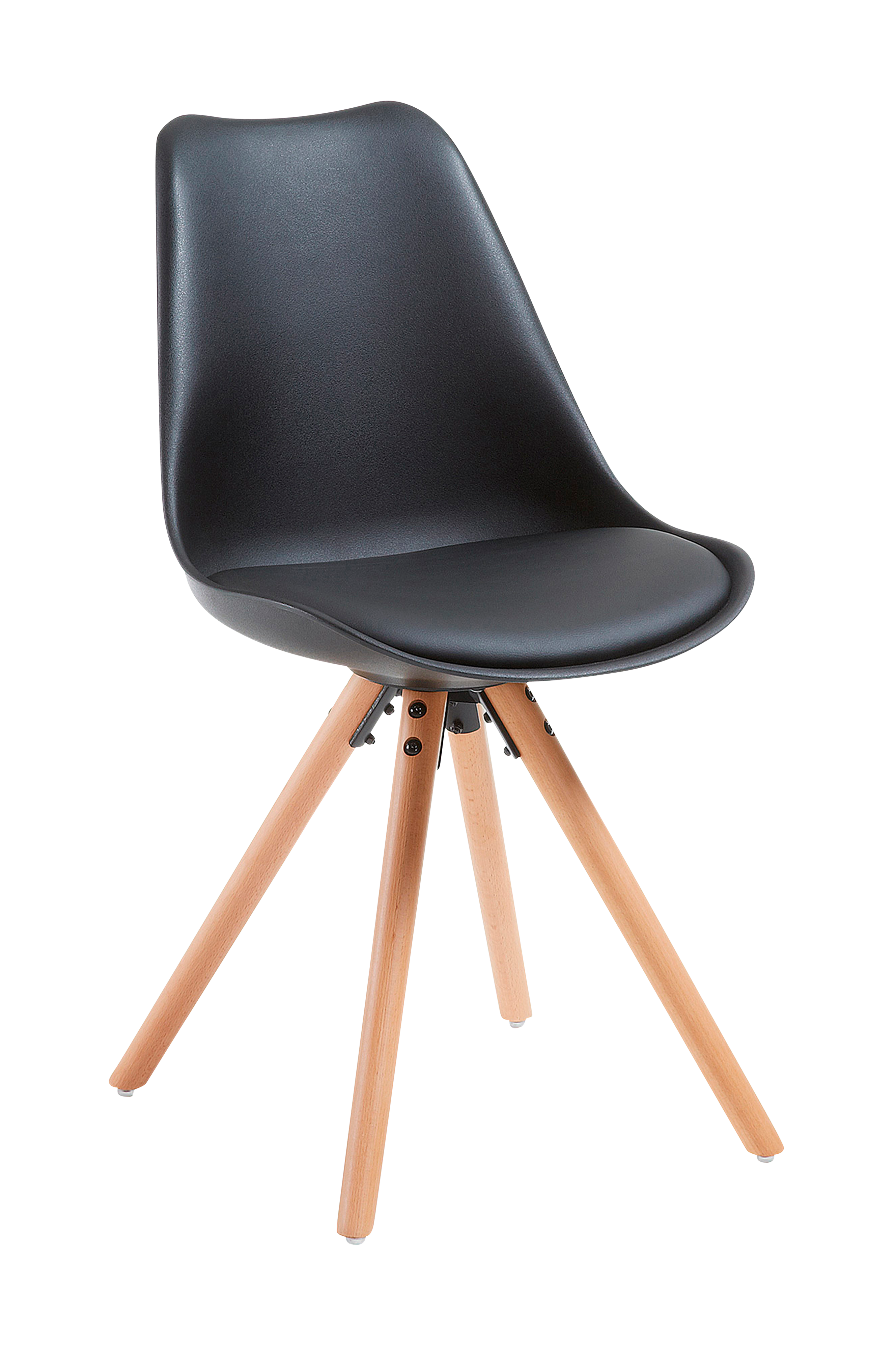 Stol i sort polypropen med tre ben i lakeret, naturfarvet bøg. 4-pak.