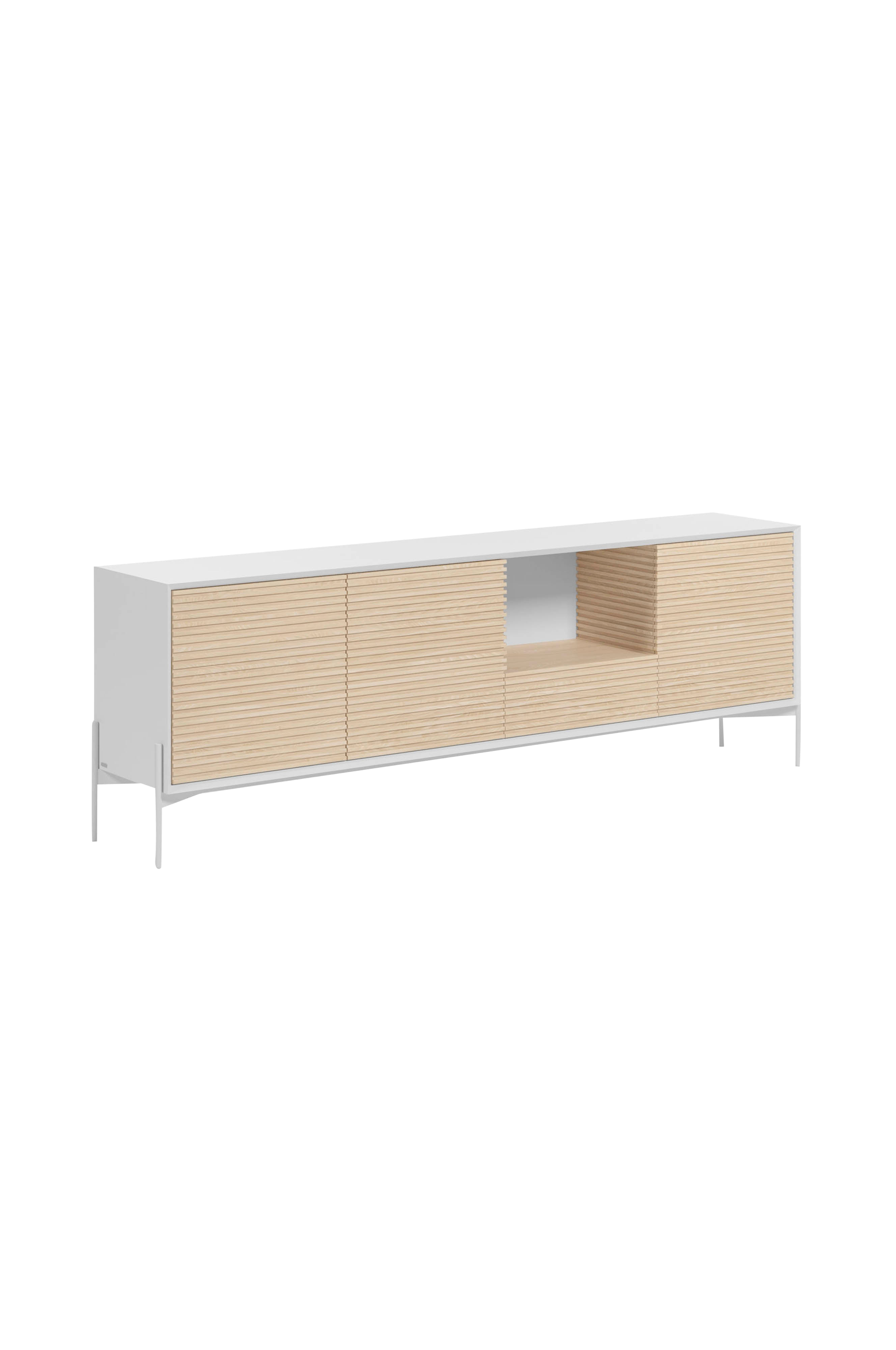 Marielle skænk af askfinér. Designet leger med askfinérens farvetoner, takket være skyggerne og træets fibermønster.
