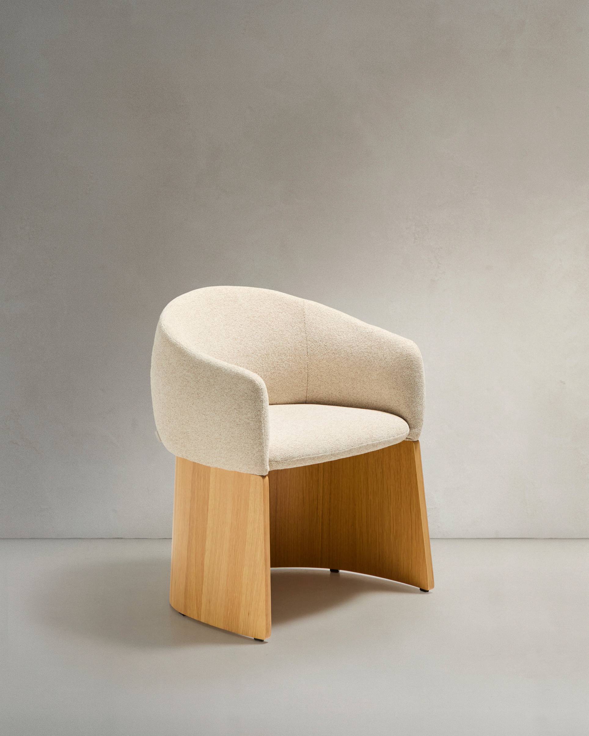 Denne stol udmærker sig ved sit afbalancerede design med et bredt, behageligt sæde, der hviler på en træbase dækket af egefiner. Den matte polyuretan-finish beskytter overfladen og tilfører møblet varme. Betrækket er lavet af småstruktureret chenille: blødt at røre ved og modstandsdygtigt over for daglig brug. Stoffet har en vandafvisende behandling. Sædet er medium fast takket være kombinationen af bånd og fjedre med 55 kg/m³ injektionsskum, som bevarer fastheden og formen over tid. Desuden er benene udstyret med filtbeskyttere for at forhindre mærker og ridser på gulvet. Et møbel, der er designet til at holde, og som er funktionelt i både private og kommercielle rum. Produktets bredde: 58 cm. Produktdybde: 53 cm.