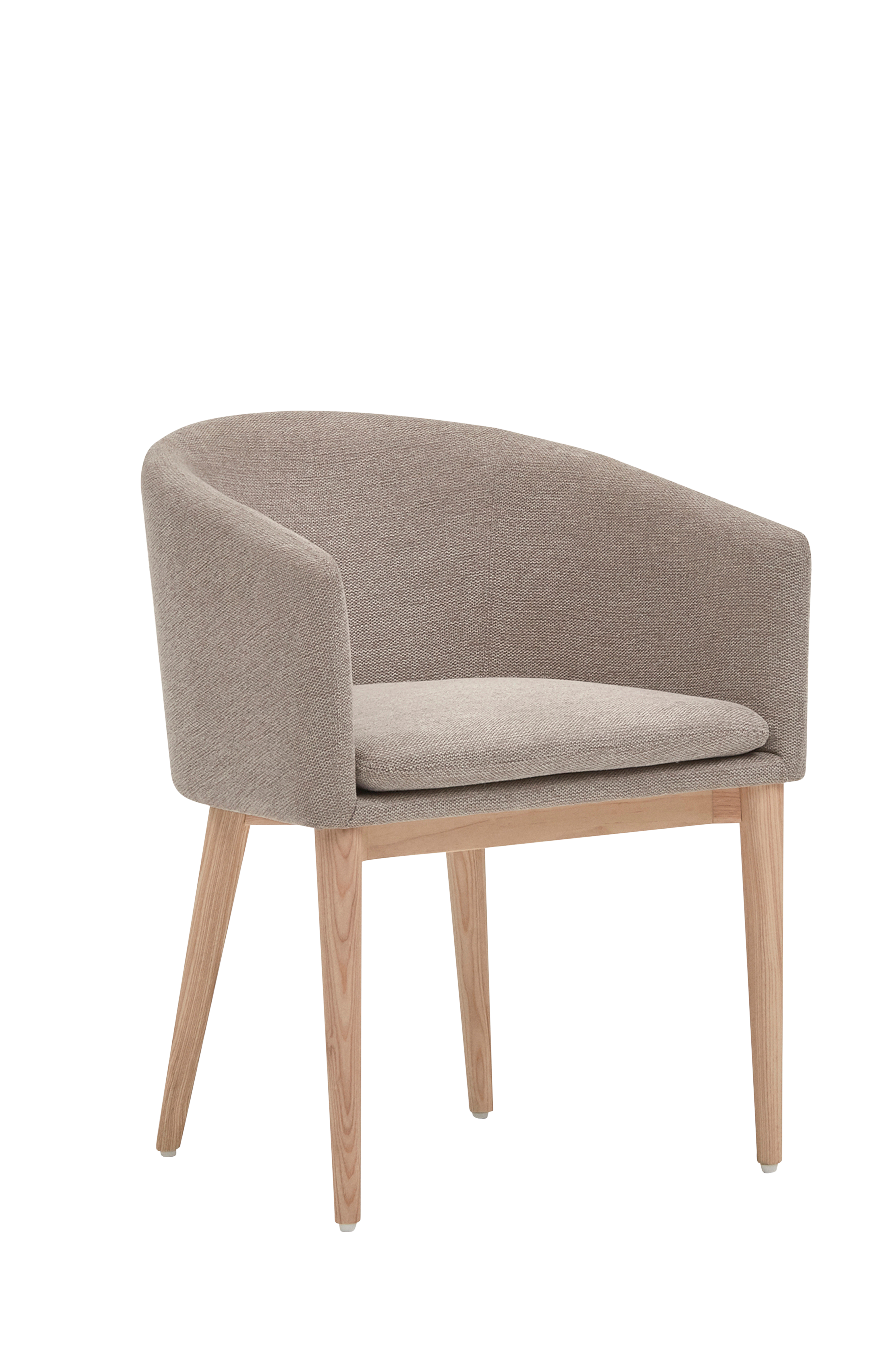 En stol der er lige så behagelig som en lænestol? Det er muligt. Stolen Harlan med armlæn, vatteret sæde og buet ryglæn omslutter dig med maksimal komfort. Perfekt til lange samtaler efter middagen. Betræk i chenille og med ben af massiv ask.
