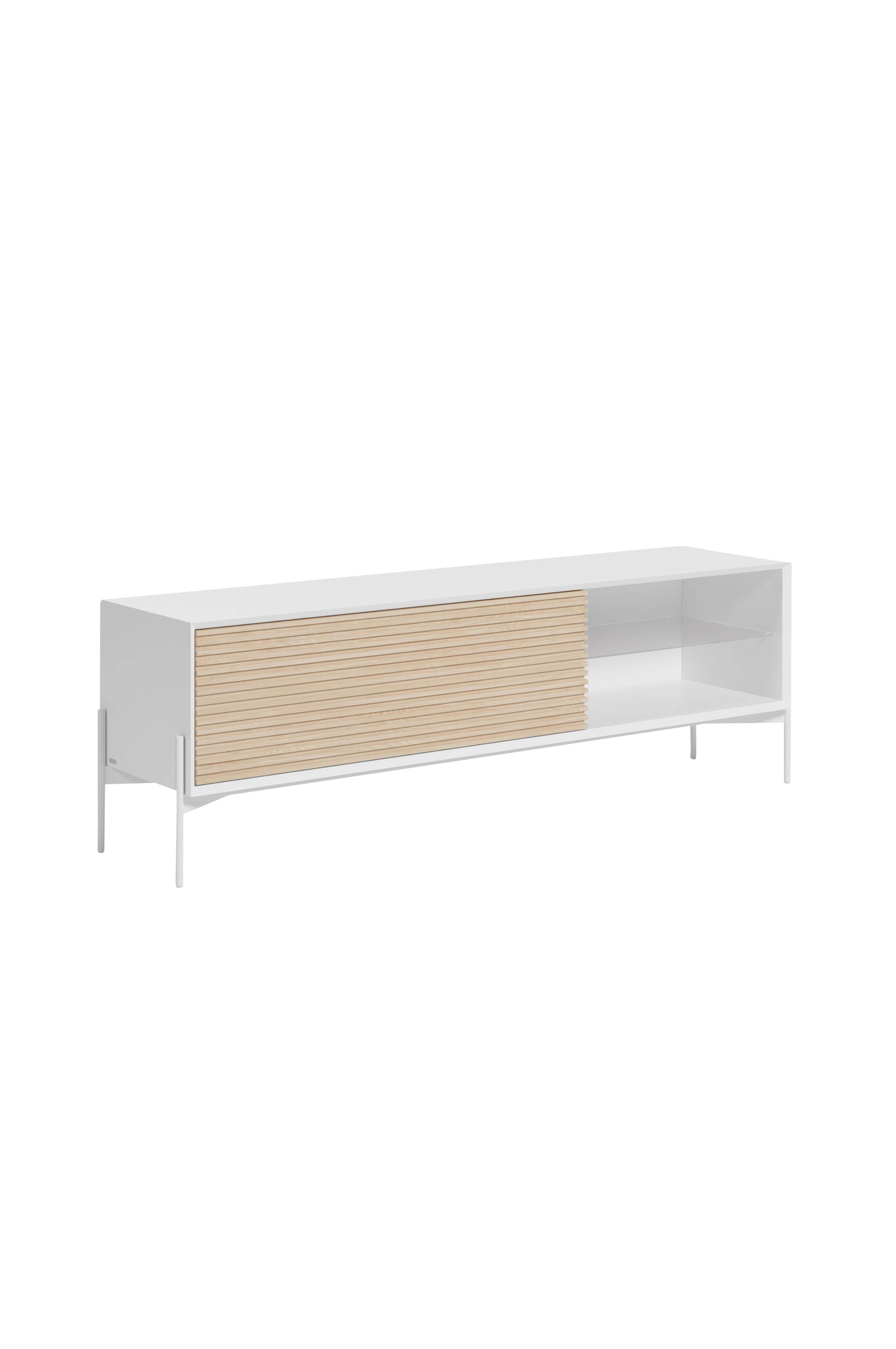 Marielle tv-bænk af askfinér. Designet leger med askfinérens farvetoner, takket være skyggerne og træets fibermønster.
