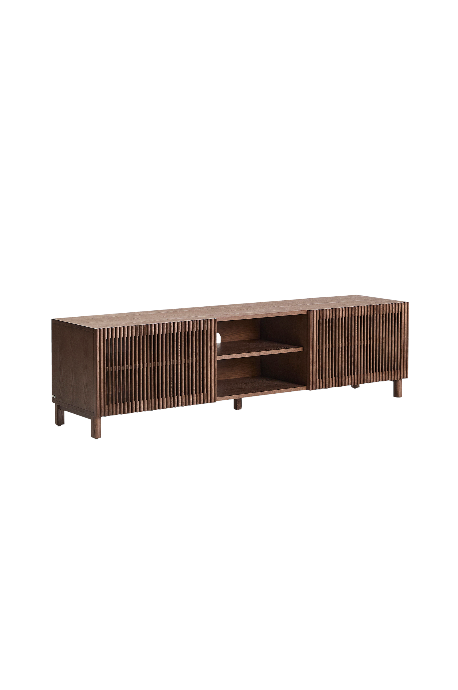 Tv-bordet fra beyla-kollektionen kombinerer essensen af asketræ med et design, der er omhyggeligt kurateret. Strukturen er lavet af askefinér, mens døren og benene er lavet af massivt træ med en elegant valnøddefinish. De hængslede døre har et sæt lameller i lodrette linjer, der giver visuel rytme og lader lyset skabe subtile kontraster på overfladen. Indvendigt giver de justerbare hylder dig mulighed for at tilpasse opbevaringspladsen efter dine behov og tilbyder funktionalitet uden at gå på kompromis med designet. Benene er udstyret med justeringsanordninger for at udligne ujævnheder i gulvet og sikre stabilitet. Alt det anvendte træ er fsc⢠100% certificeret træ med en ansvarlig skovbrugsmodel. Et funktionelt og dekorativt møbel, der fuldender soveværelset med en varm og tidløs stil. Produktets bredde: 180 cm. Produktdybde: 42,5 cm.
