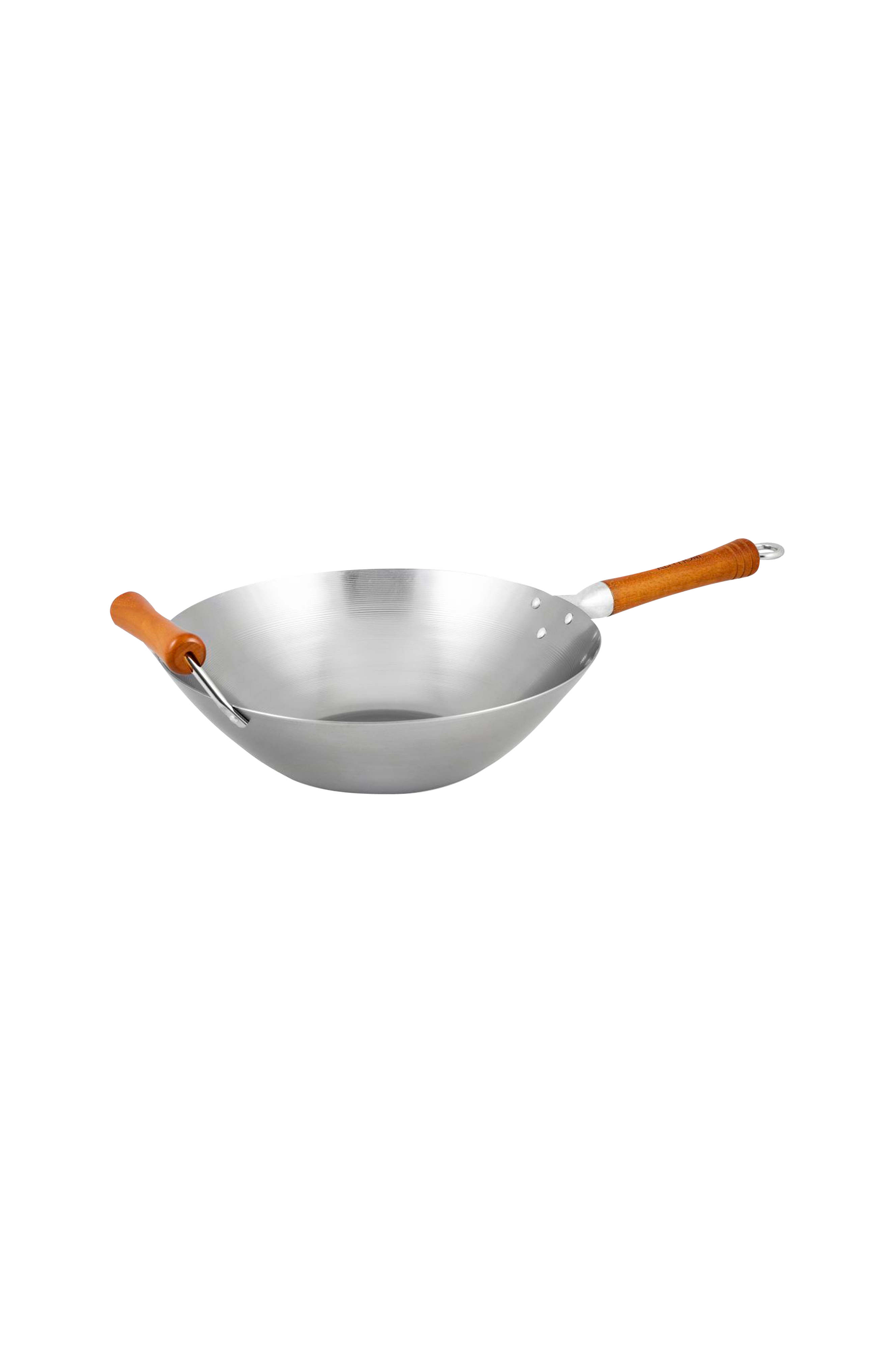 Wok der er lavet af stærkt 1,8 mm kulstofstål, som er en legering af stål og jern, der danner et meget stærkt og robust metal. Panden har en flad bund og passer til enhver type komfur, inklusive induktion.