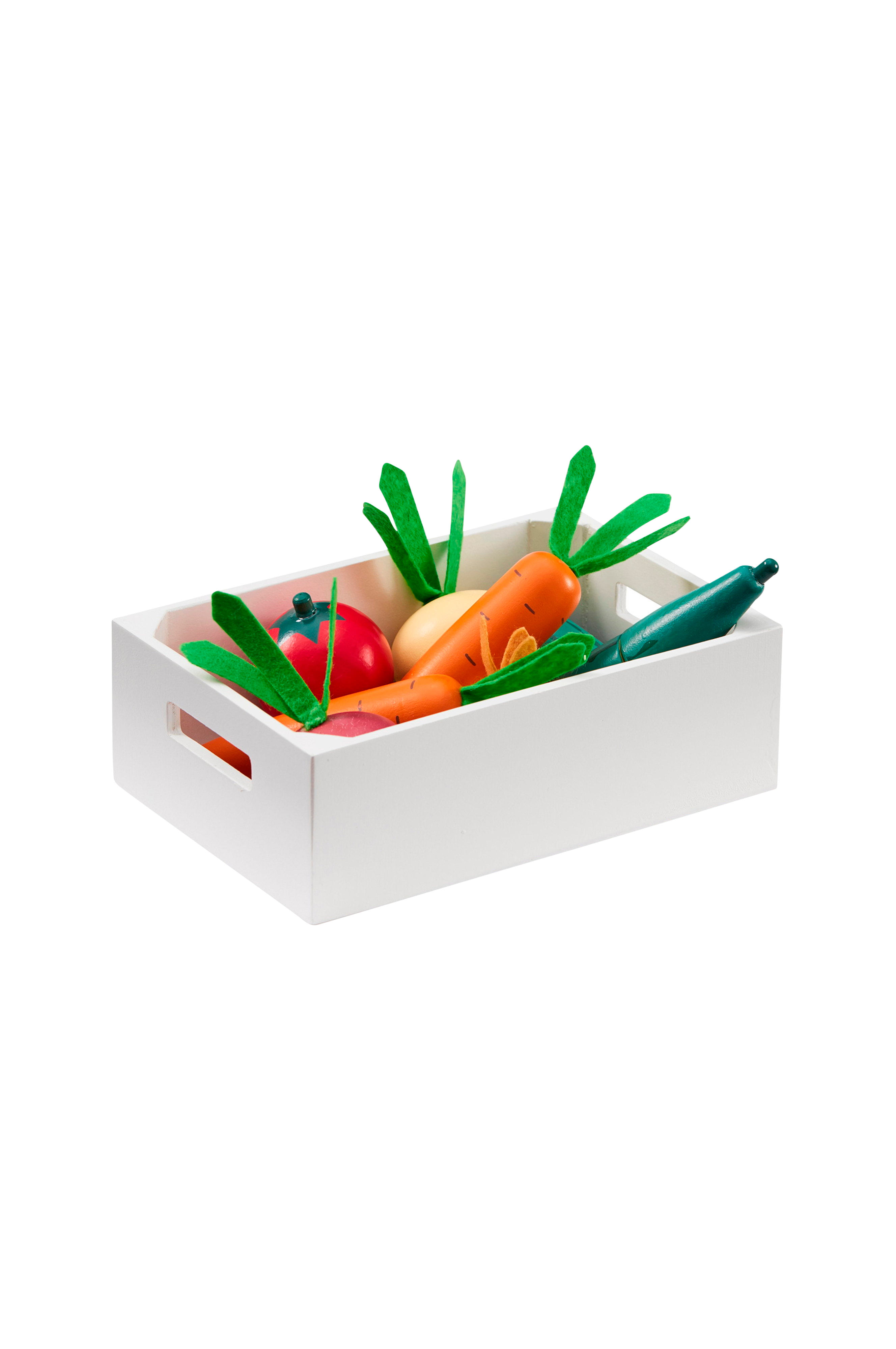 Indeholder tomat, løg, gulerod, citron og agurk. Agurken og citronen kan deles og sættes sammen igen med velcro.