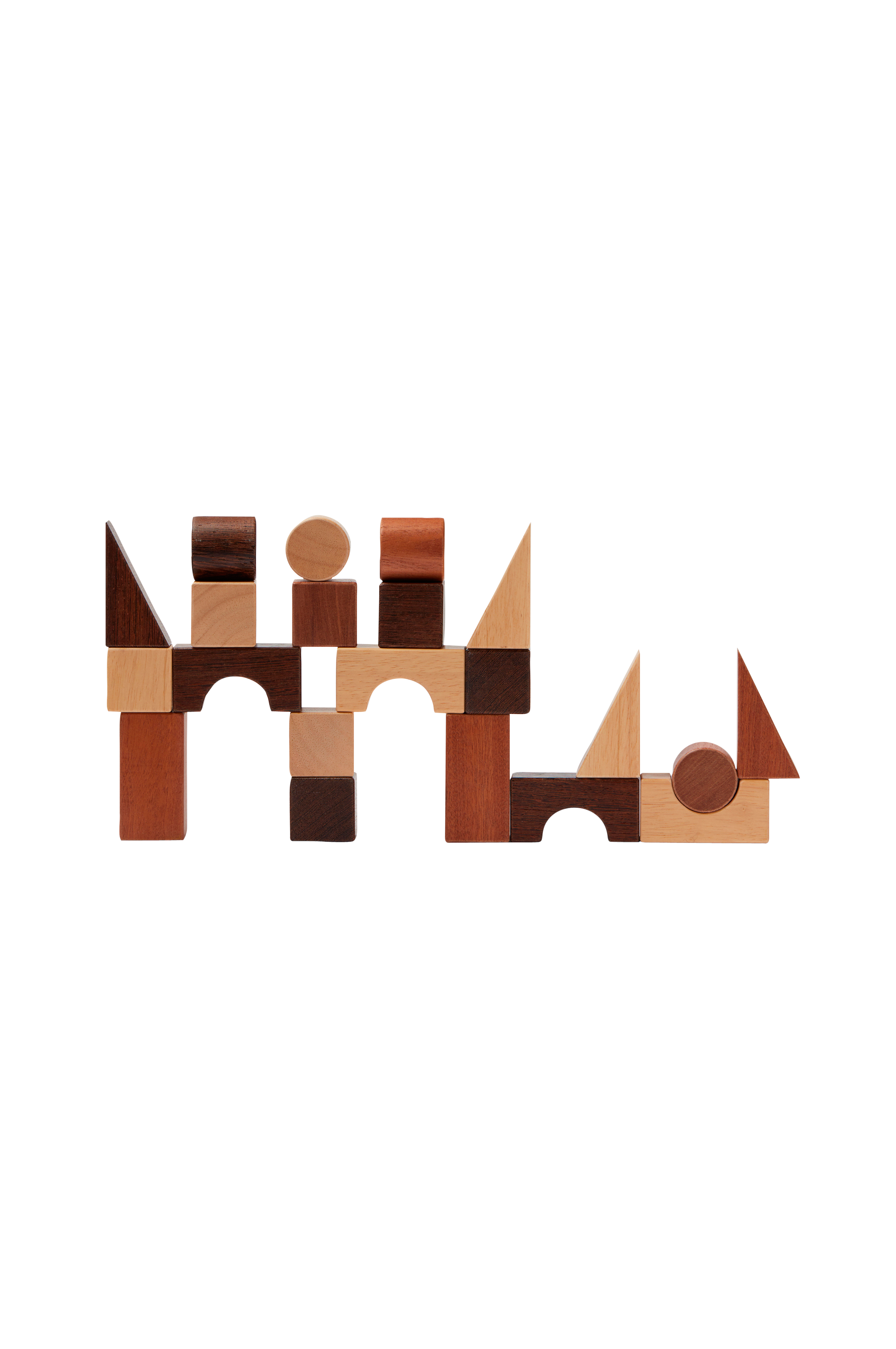 Klassiske byggeklodser i tre forskellige lyse og mørke FSC-certificerede træsorter og forskellige geometriske former. Brug klodserne som et puslespil, byg et tårn, sorter, organiser.