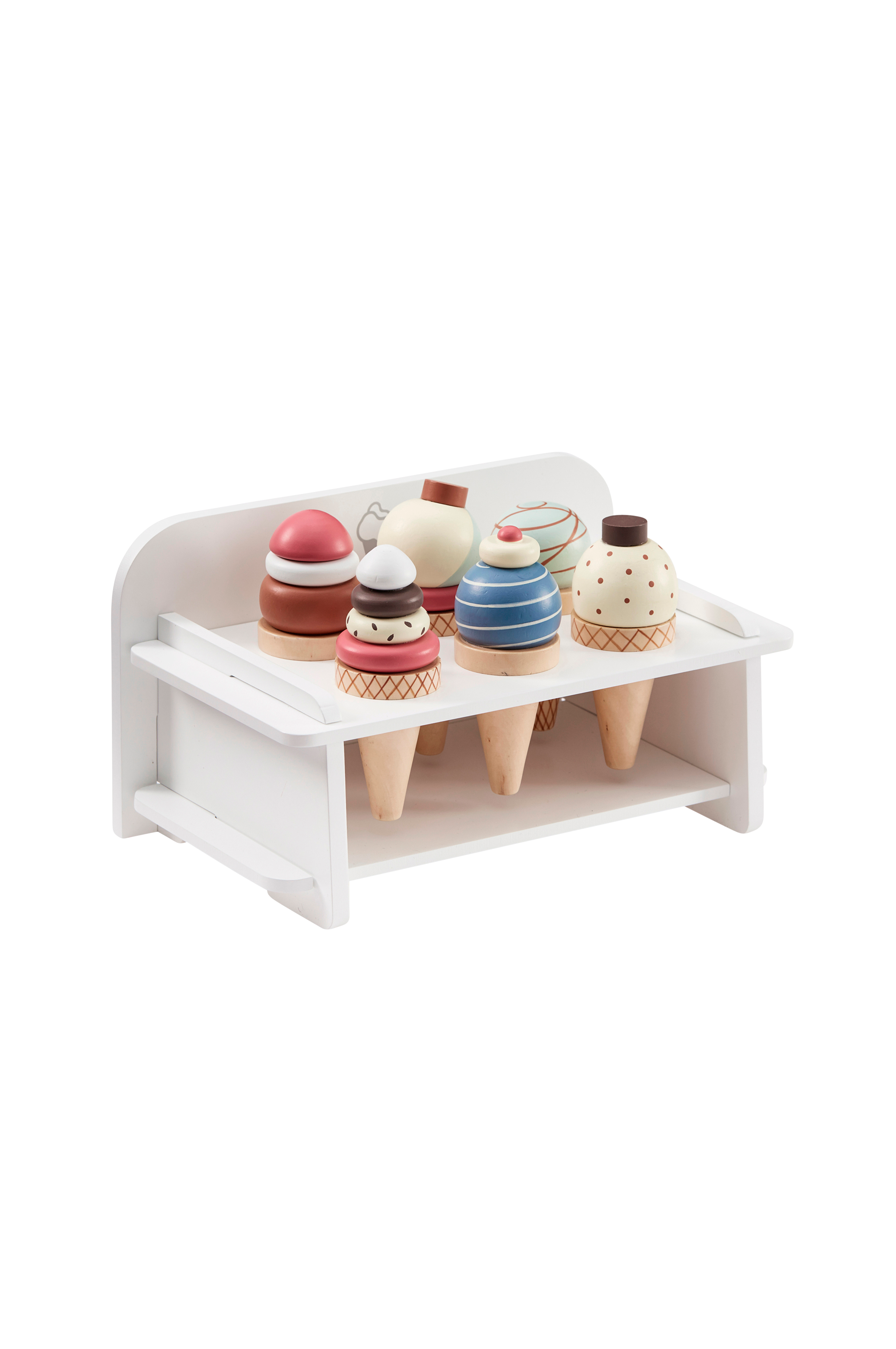 Issæt af træ med 6 isIssættet er hvidt- og pastelfarvet og isene er designet til at ligne forskellige is. Passer perfekt til at sælge i legetøjskiosken eller -butikken.