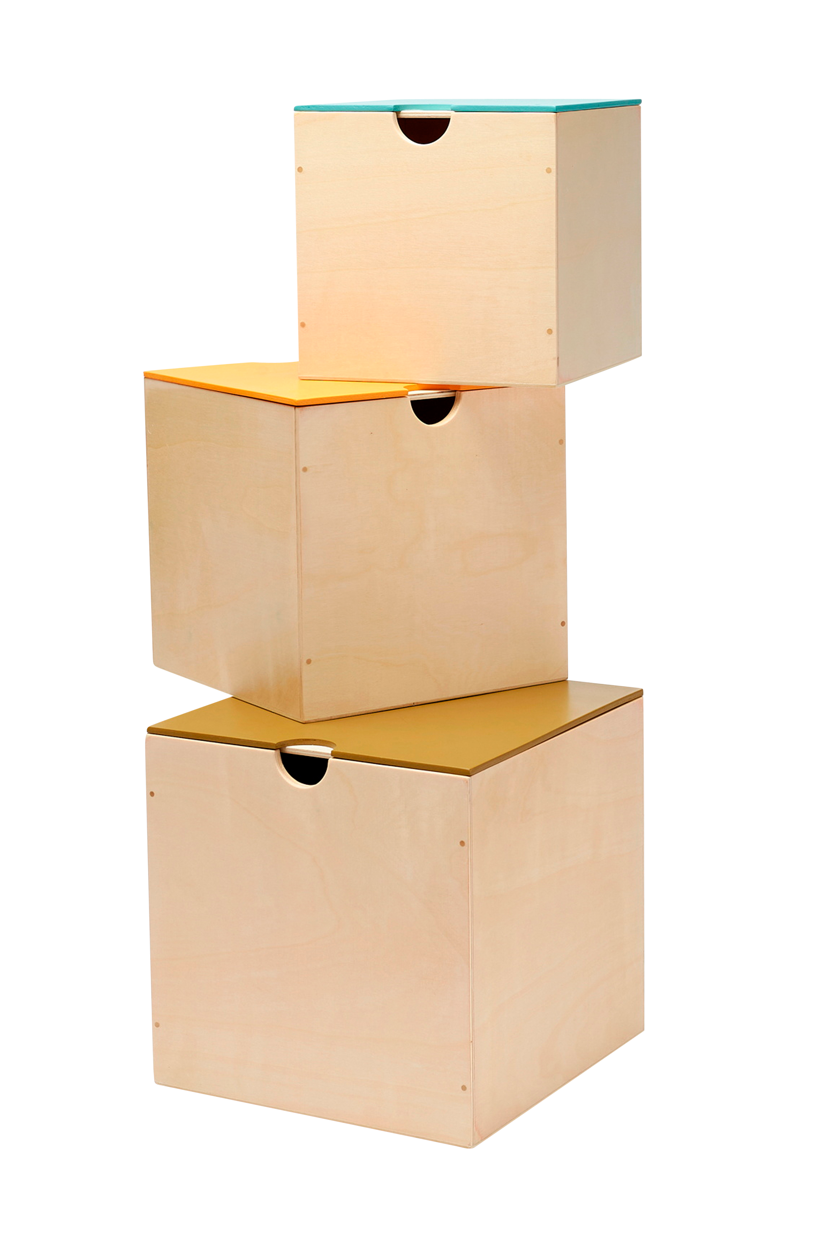 Tre opbevaringsbokse i træ med forskelligfarvet låg. Kan opbevares i hinanden eller fungere som opbevaringsboks hver for sig.