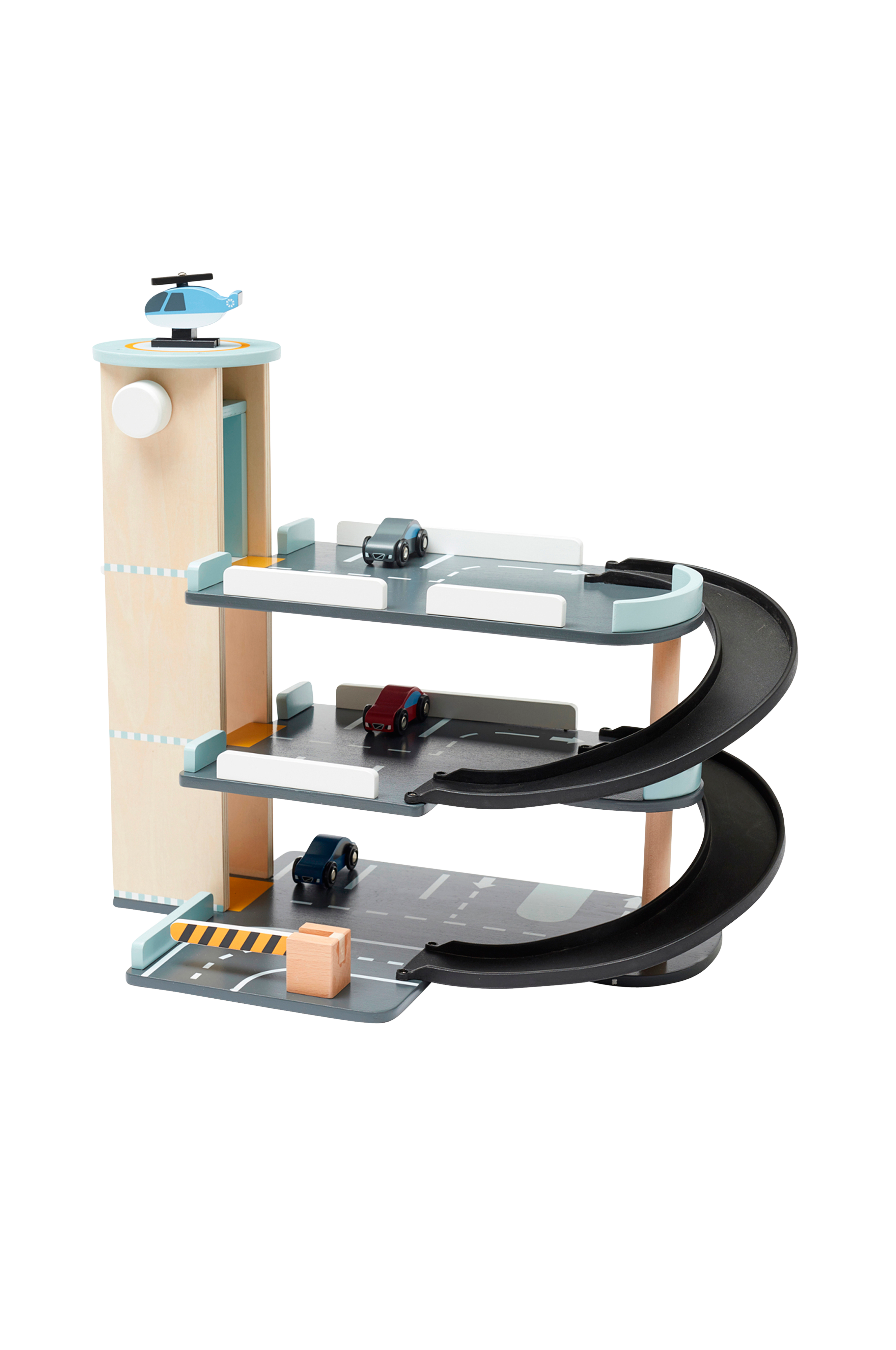 Parkeringshus i træ i tre etager med tre medfølgende biler, 1 helikopter og helikopterplatform på toppen. Parkeringshuset har vridbar bom og en elevator der kan køre op og ned, parkeringspladser og ramper. Inspirerer til fantasifuld og sjov leg samt udvikler barnets finmotorik og hånd-/øjekoordination.