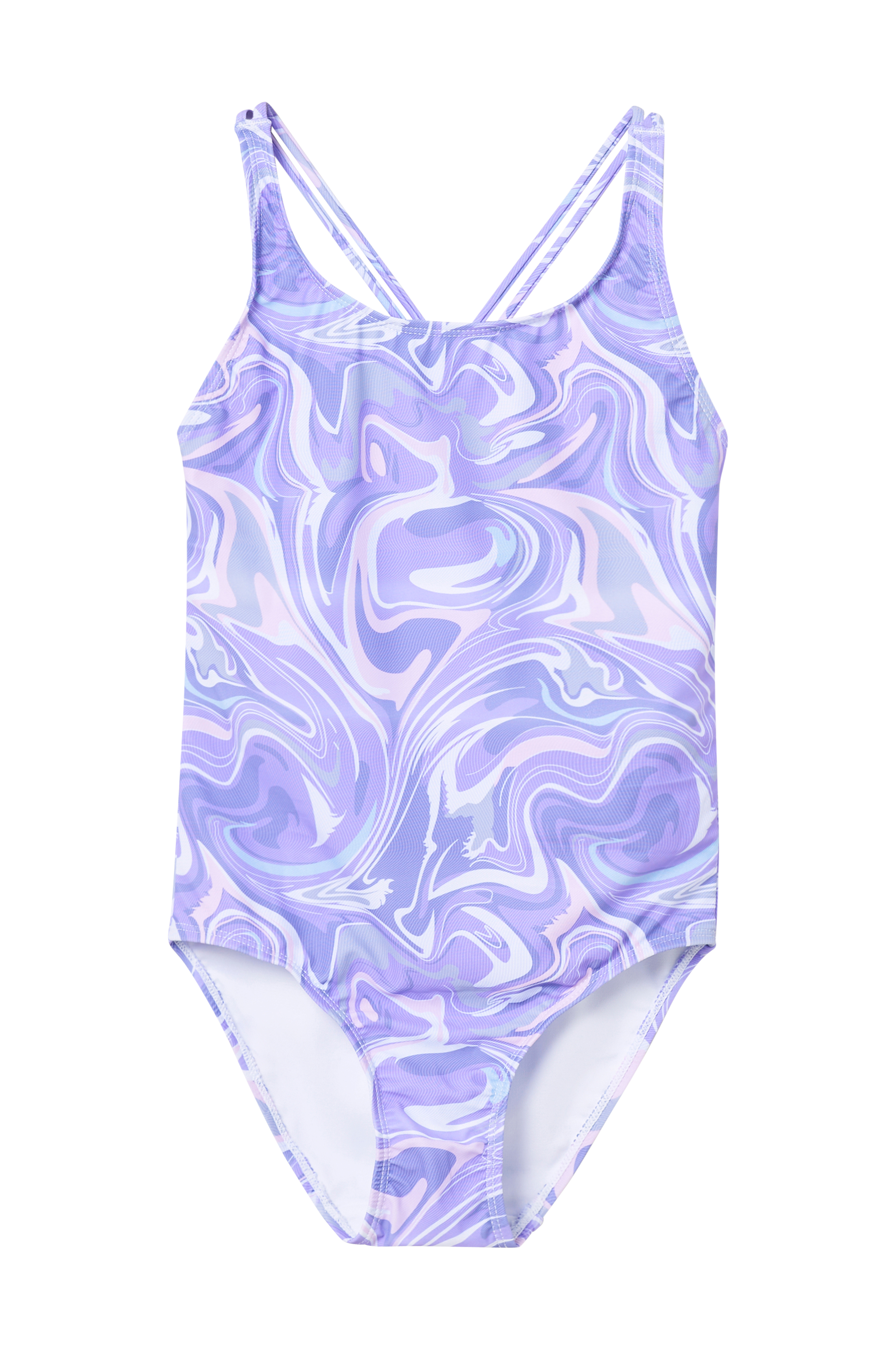 Badedragt med dobbelte, smalle skulderstropper som er krydsede i ryggen. Foret foran.