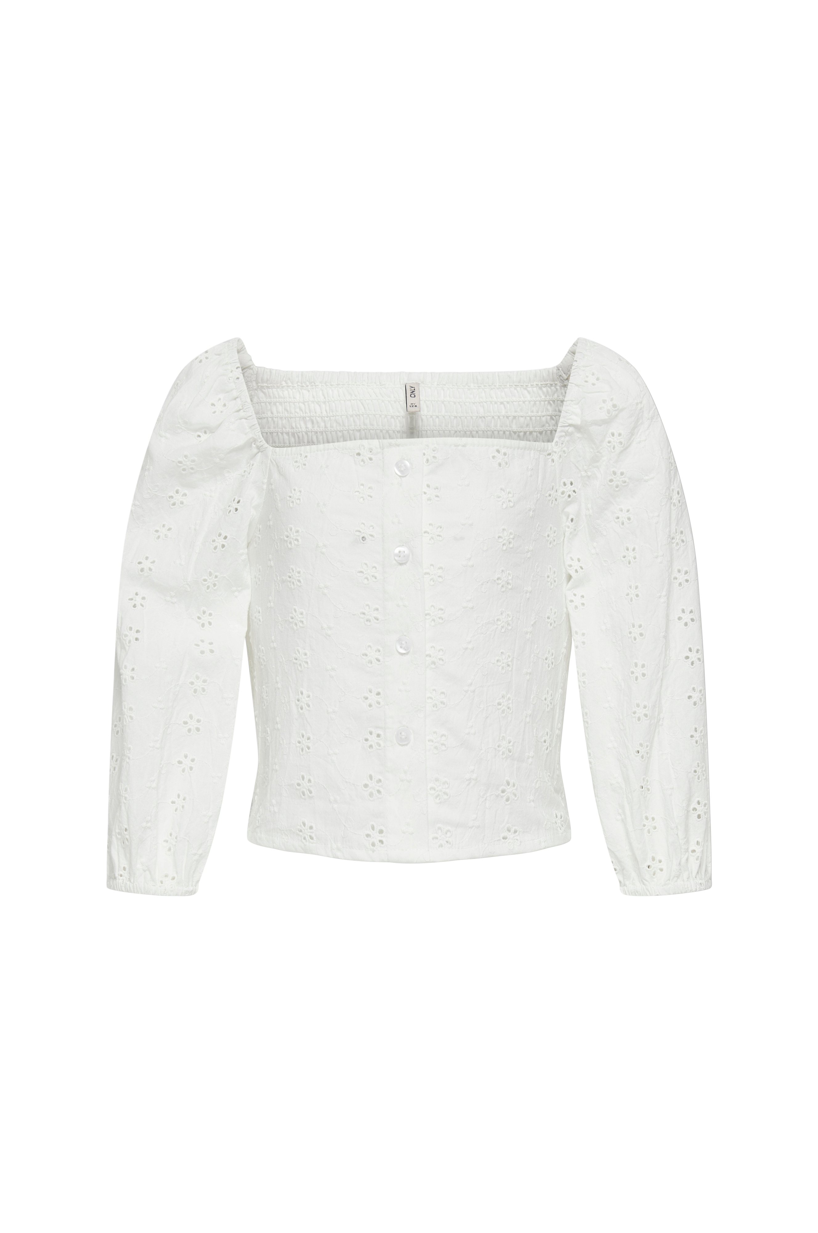 • Figursyet model med hulbroderier overalt• Bred, elastisk smock bagpå• Kantet halsudskæring med indlagt elastik over skuldrene• Elastik ved manchetterne