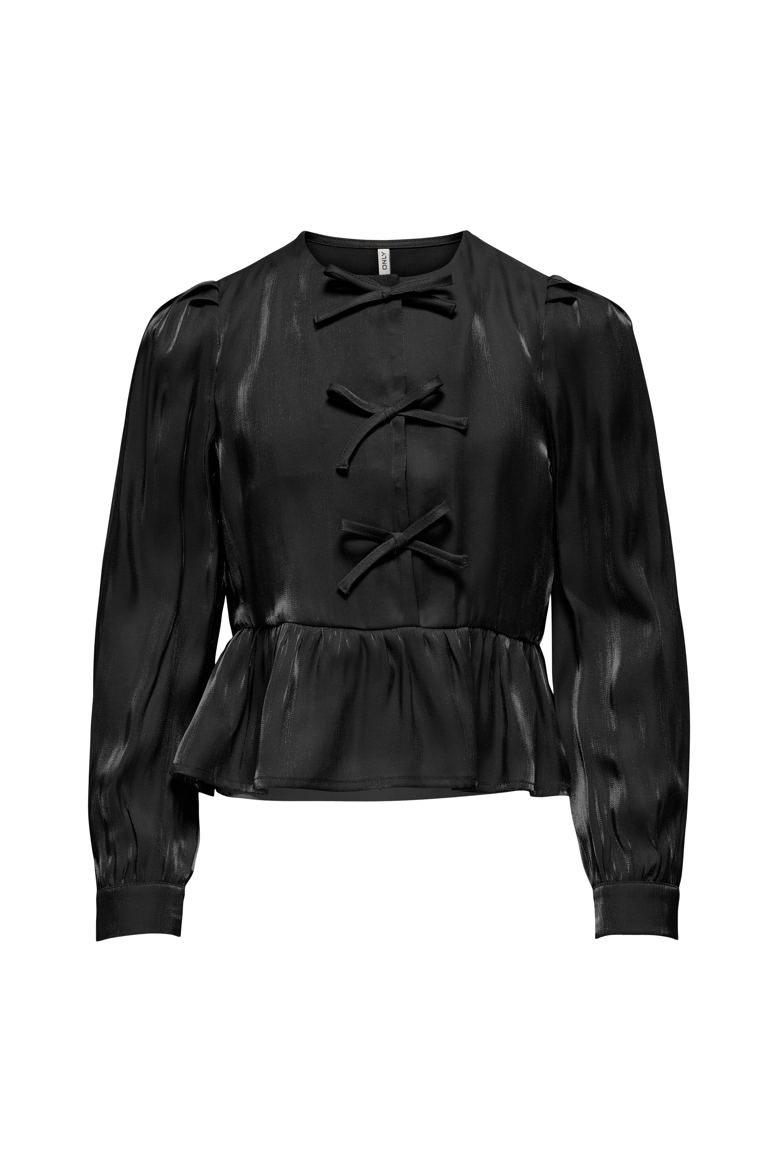 • Bluse i blankt materiale med rund halsudskæring• Lange pufærmer med tynde manchetter• Trykknapper foran med dekorative sløjfer oven på• Volant ved nederste kant
