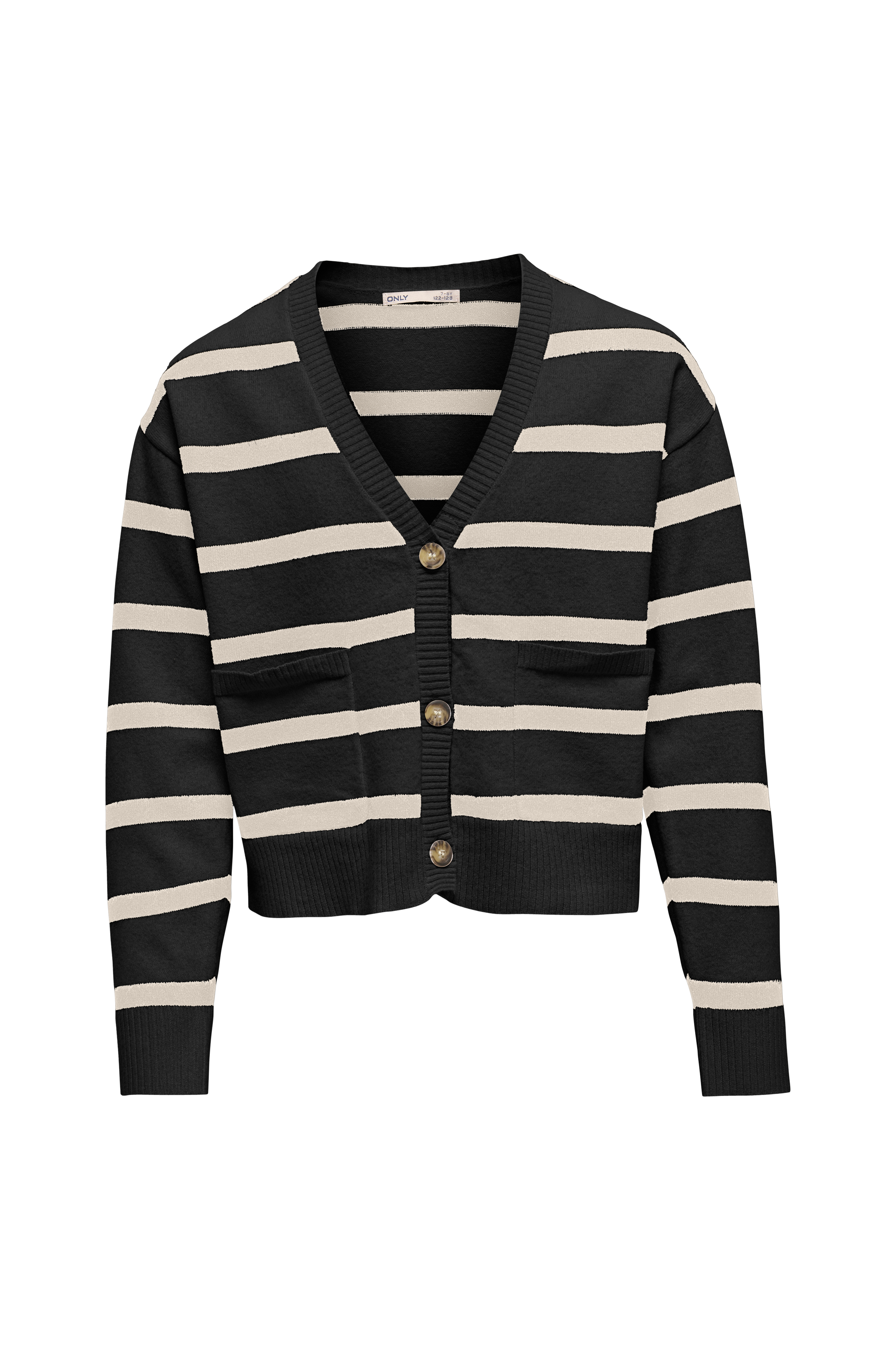 • Fintstrikket, langærmet, stribet cardigan• V-formet halsudskæring• Lukning foran med dekorative, synlige knapper• To lommer foran• Ribstrik ved manchetterne, nederst, foran og på lommerne