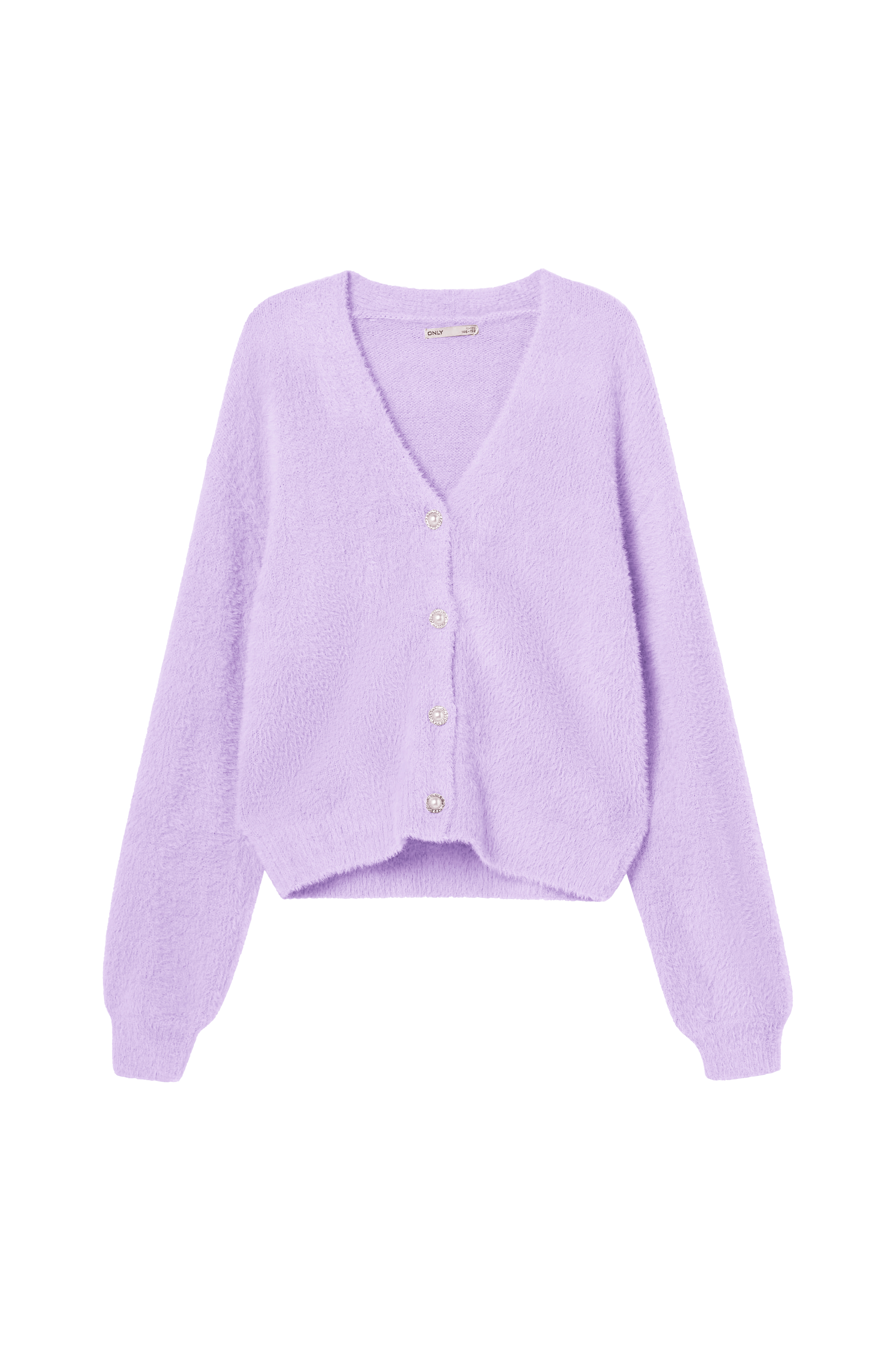 • Fintstrikket cardigan med blød, håret overflade• Perleknaper med skinnende sten hele vejen rundt• V-udskæring• Ribbede kanter ved manchetterne og nederst