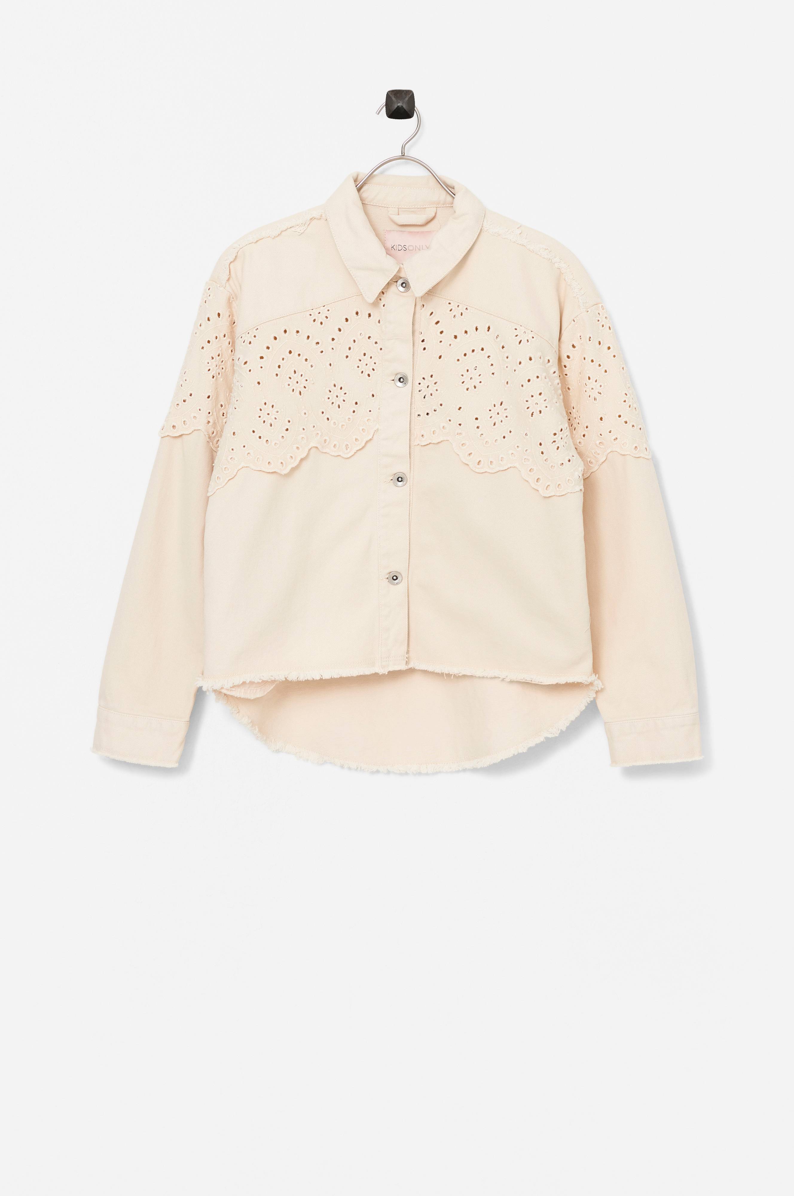 Jakke i bomuldstwill med hulbroderi foroven foran og på ærmerne. Frynset kant på skuldrene, bærestykket og kanten forneden. Knapper foran. Vid model som er markant længere bagpå.