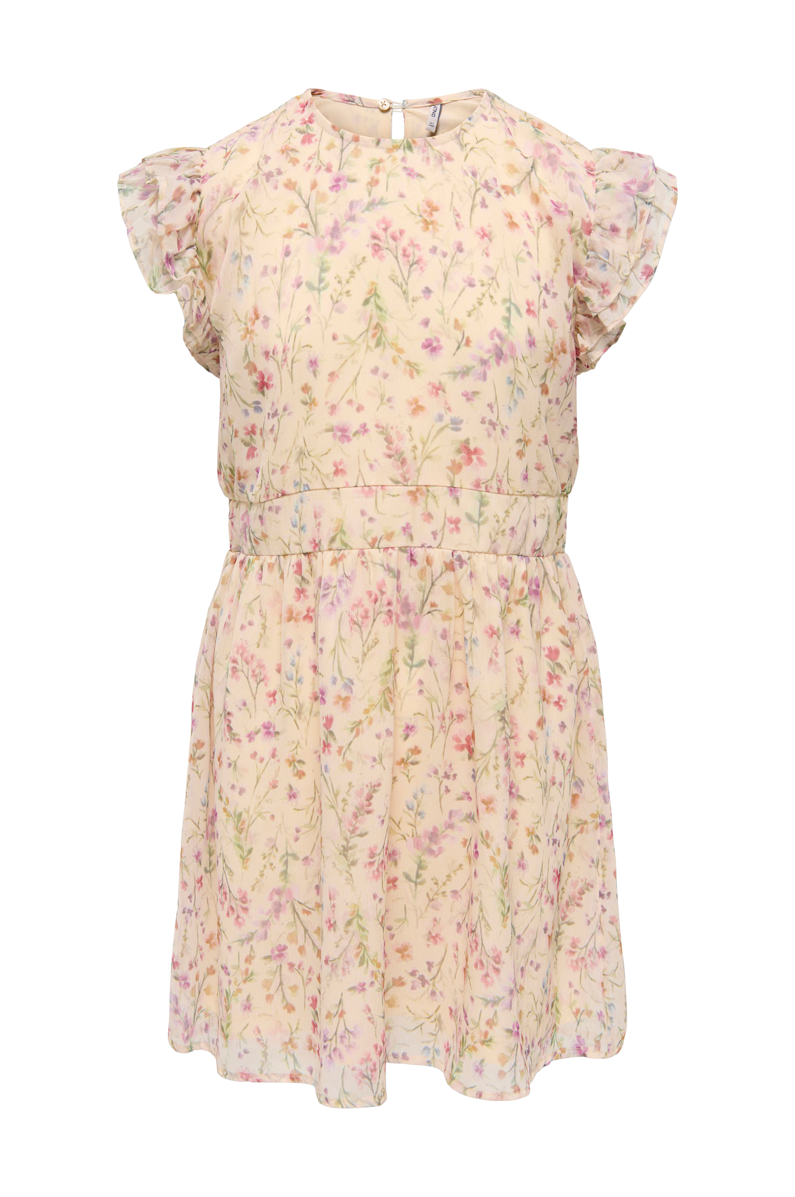 • Kjole i chiffon med trikotfor• Rund halsudskæring med nøglehulslukning i nakken• Korte flæseærmer• Udskæring ved taljen med smock i ryggen