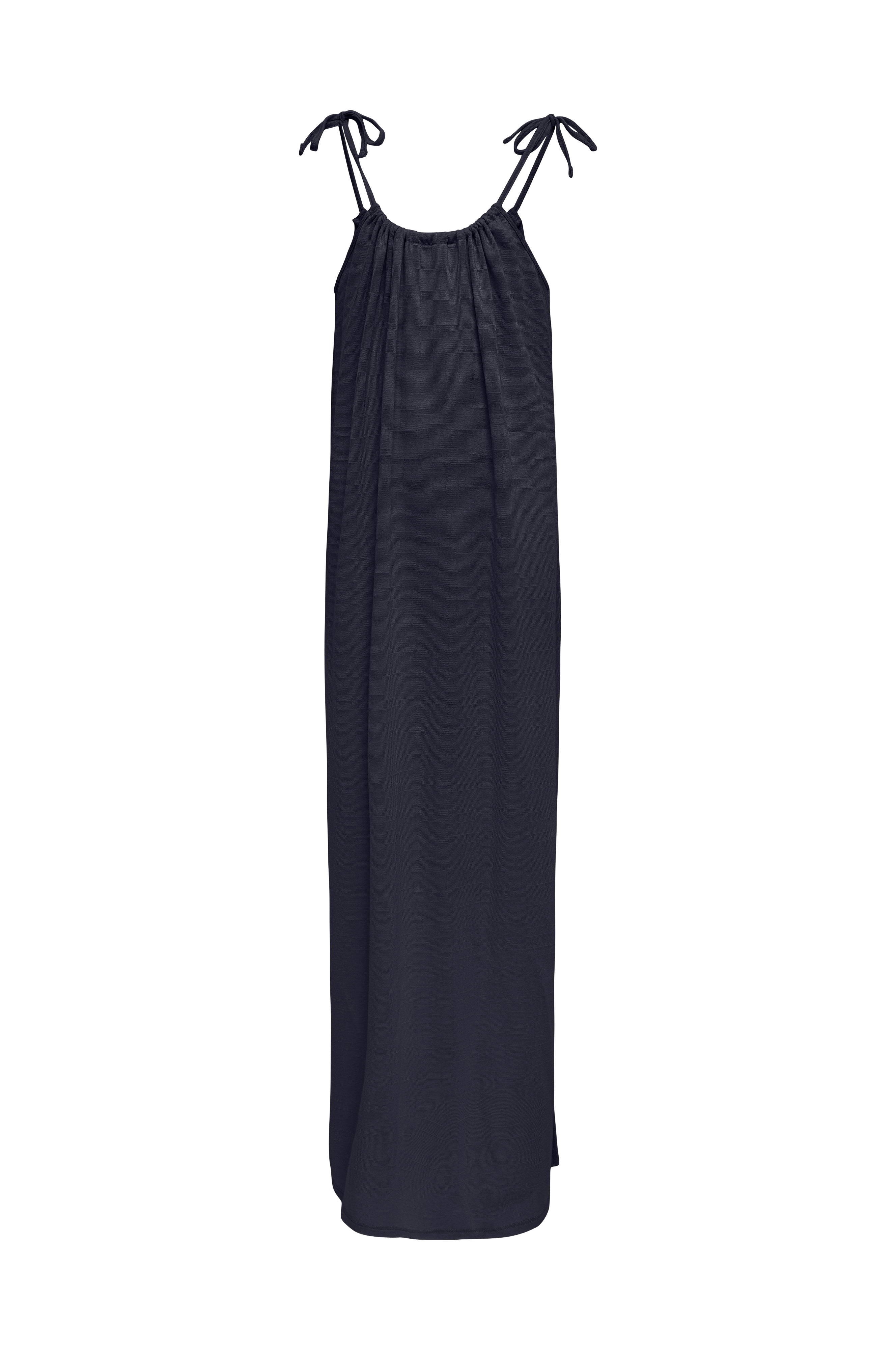 • Lang, ærmeløs kjole• Tynde skulderstropper med dekorativ sløjfe• Rund, rynket halsudskæring• Slids nede i siderne