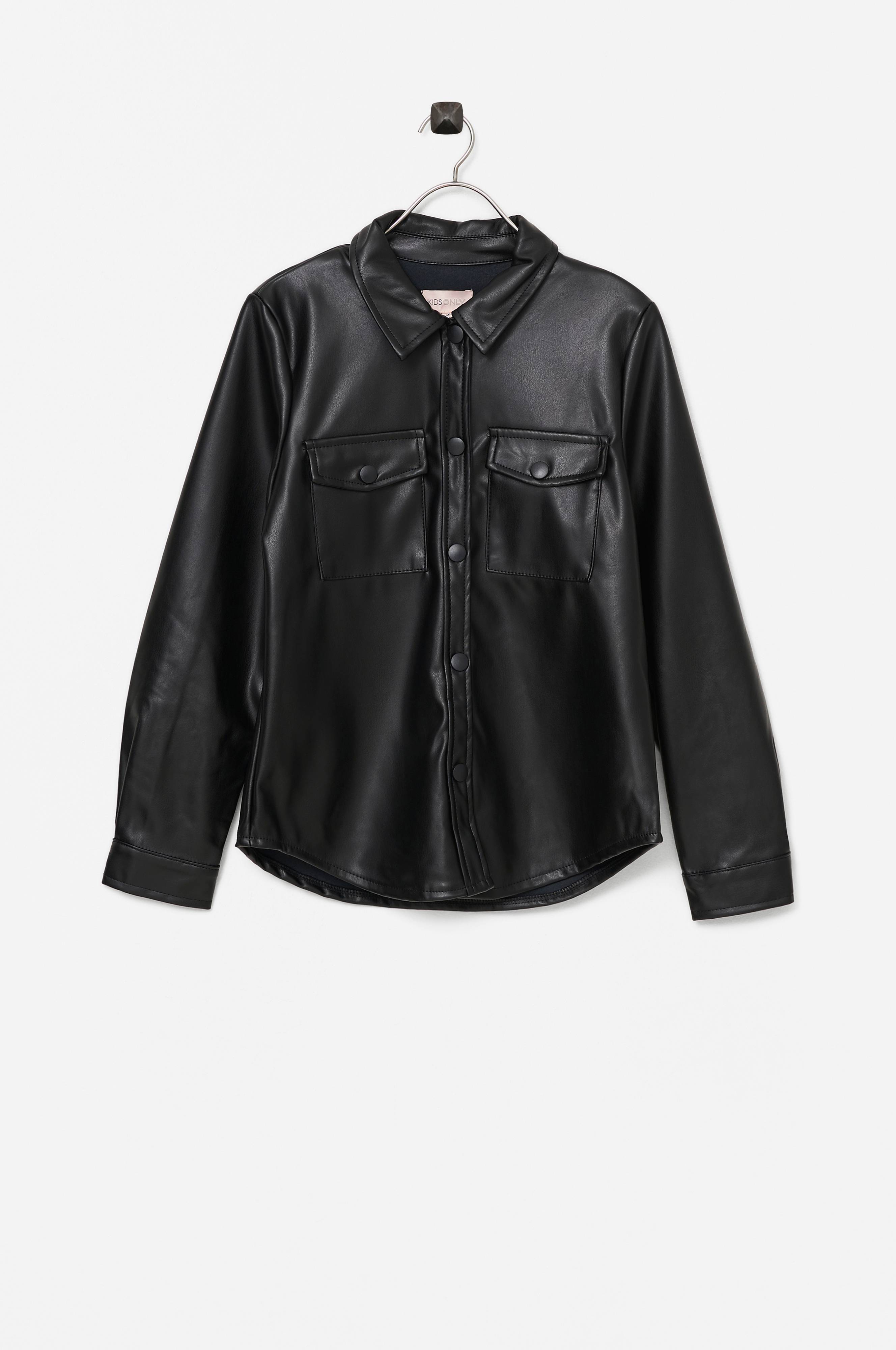 Skjorte af imiteret skind med trykknapper. To brystlommer med klap med knap. Trykknap i ærmekanten.