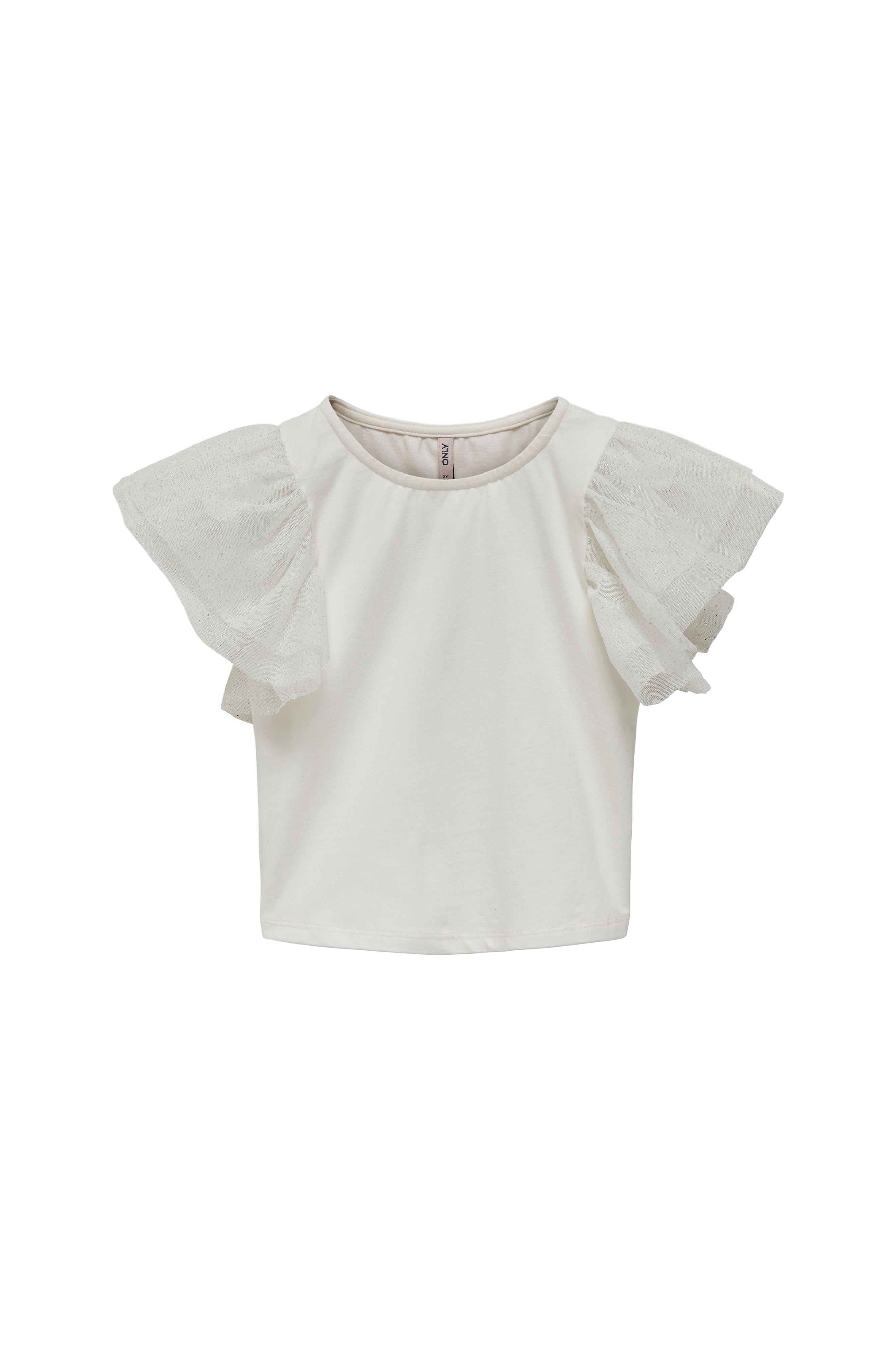 • Top i elastisk jersey• Rund halsudskæring• Ventilation med knap i nakken• Korte flæseærmer i glitrende dobbeltlag af tyl