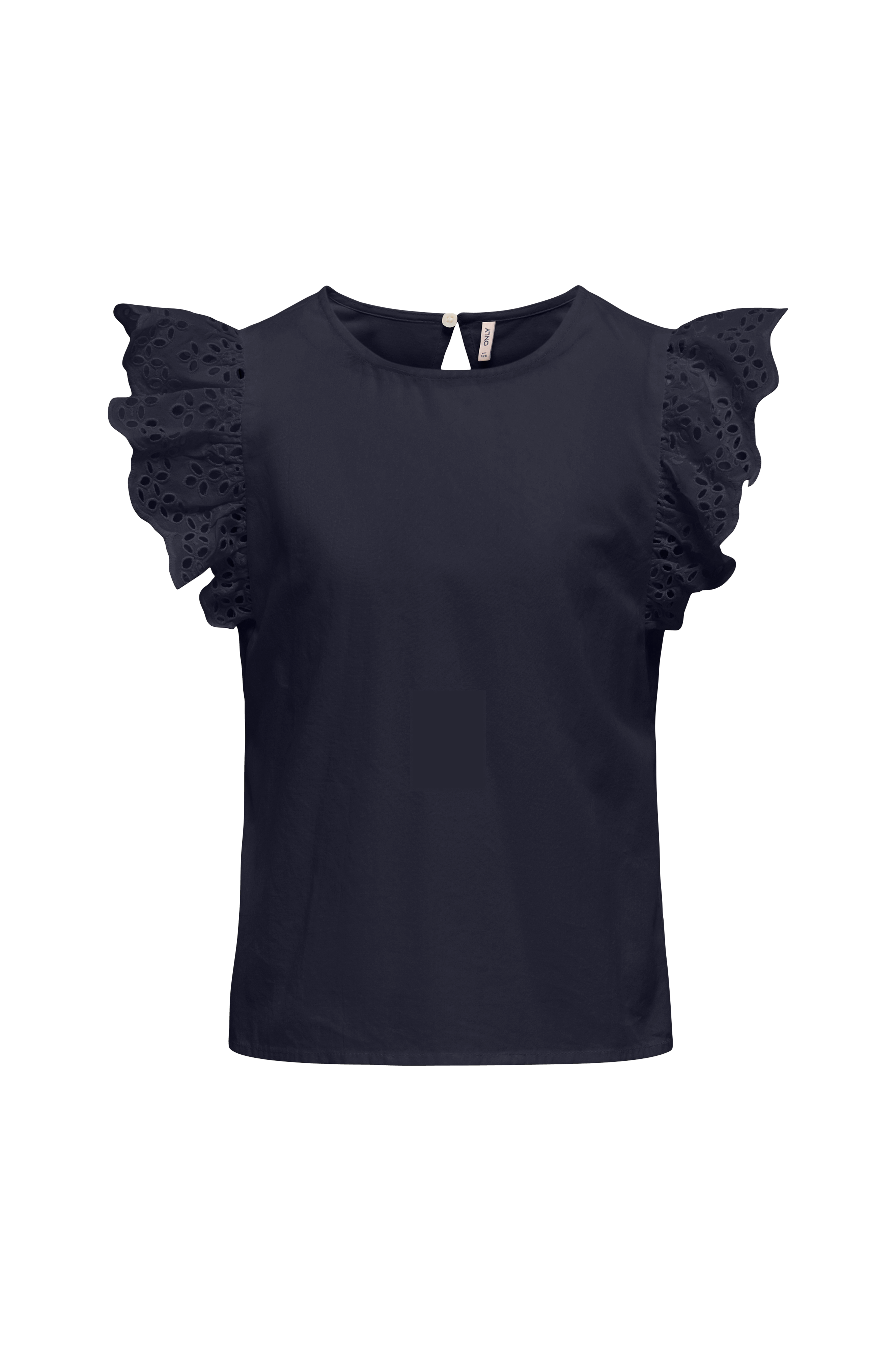• Top i bomuld• Rund halsudskæring• Korte flæseærmer med hulbroderier• Åben ryg ned til taljen med knap i nakken• Elastik bagpå ved taljen