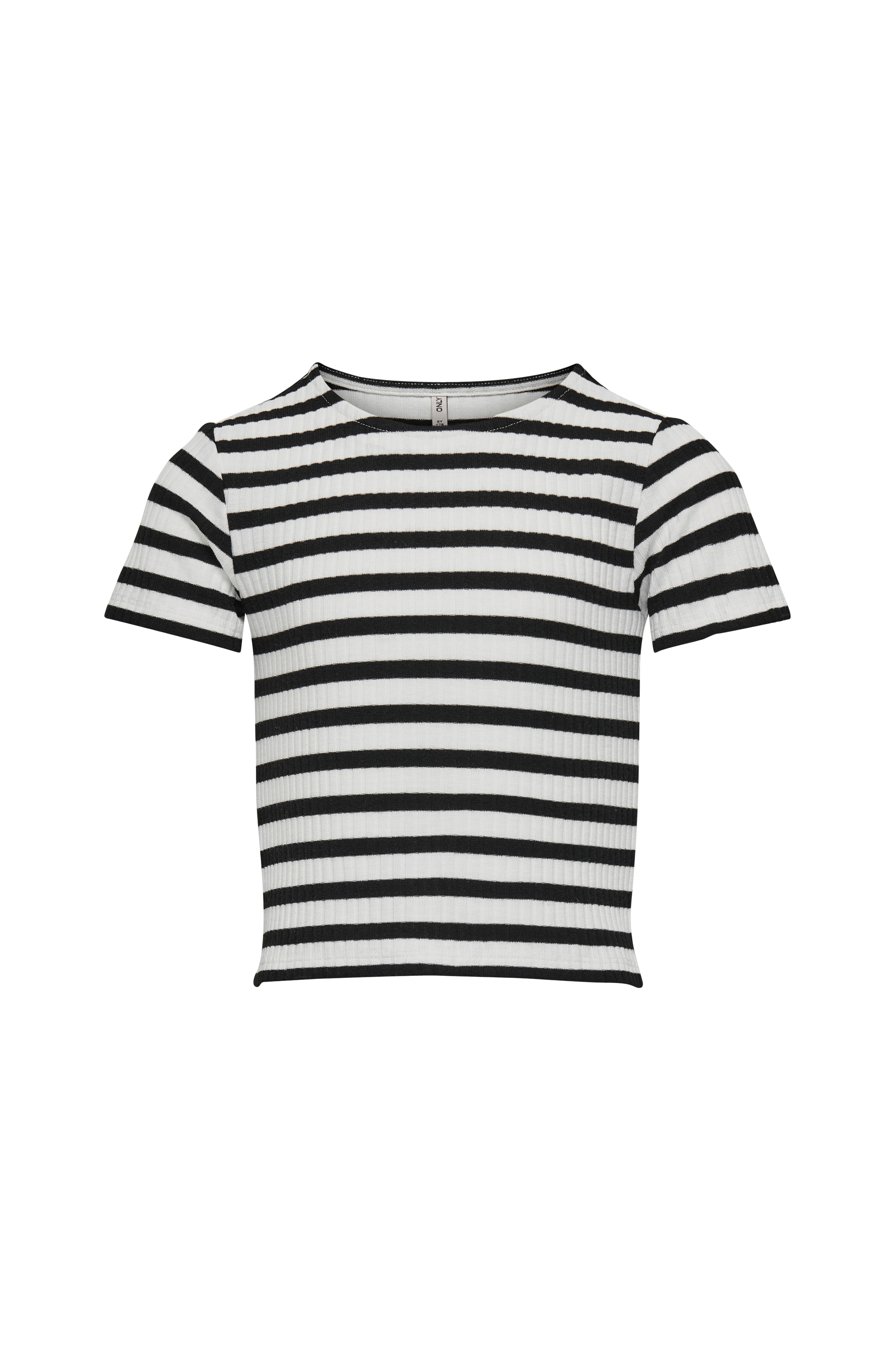 • Stribet, elastisk top i viskoseblanding• Rund halsudskæring• Korte ærmer