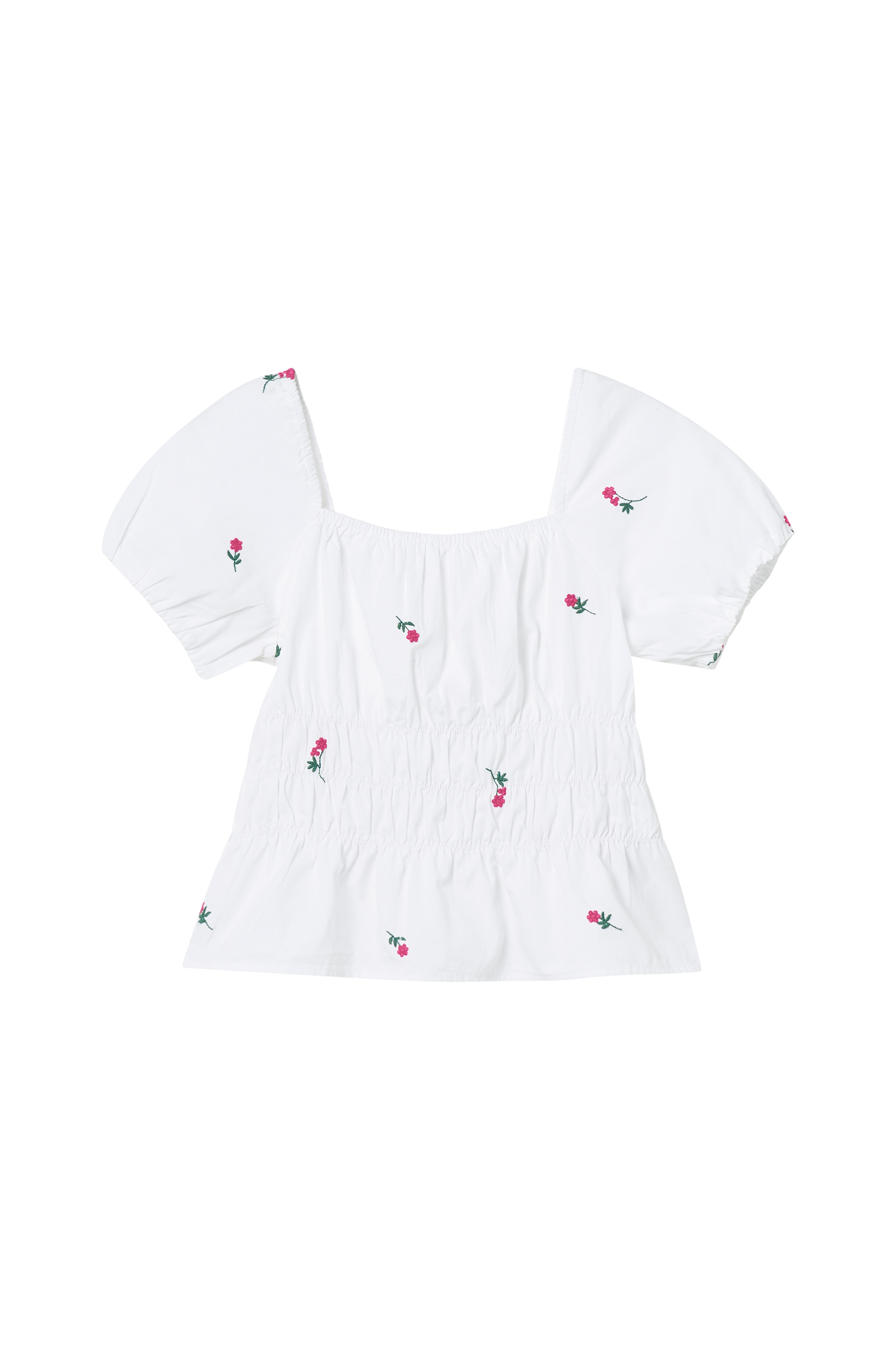 • Firkantet off-shoulder udskæring med elastik hele vejen rundt• Korte ærmer med elastisk bånd ved manchetterne• Elastisk bånd ved taljen• Broderede blomster