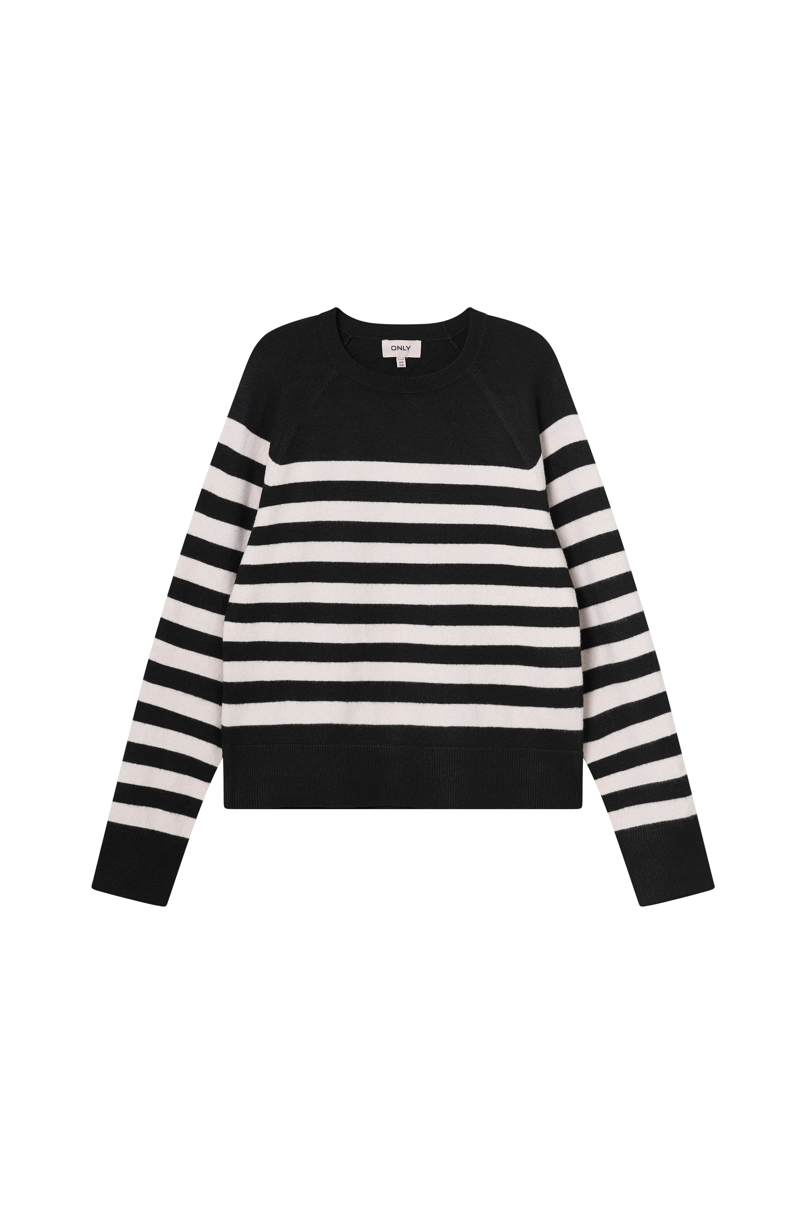 • Strikket trøje• Rund, ribbet halsudskæring• Raglanærmer• Ribstrik ved manchetterne og nederst