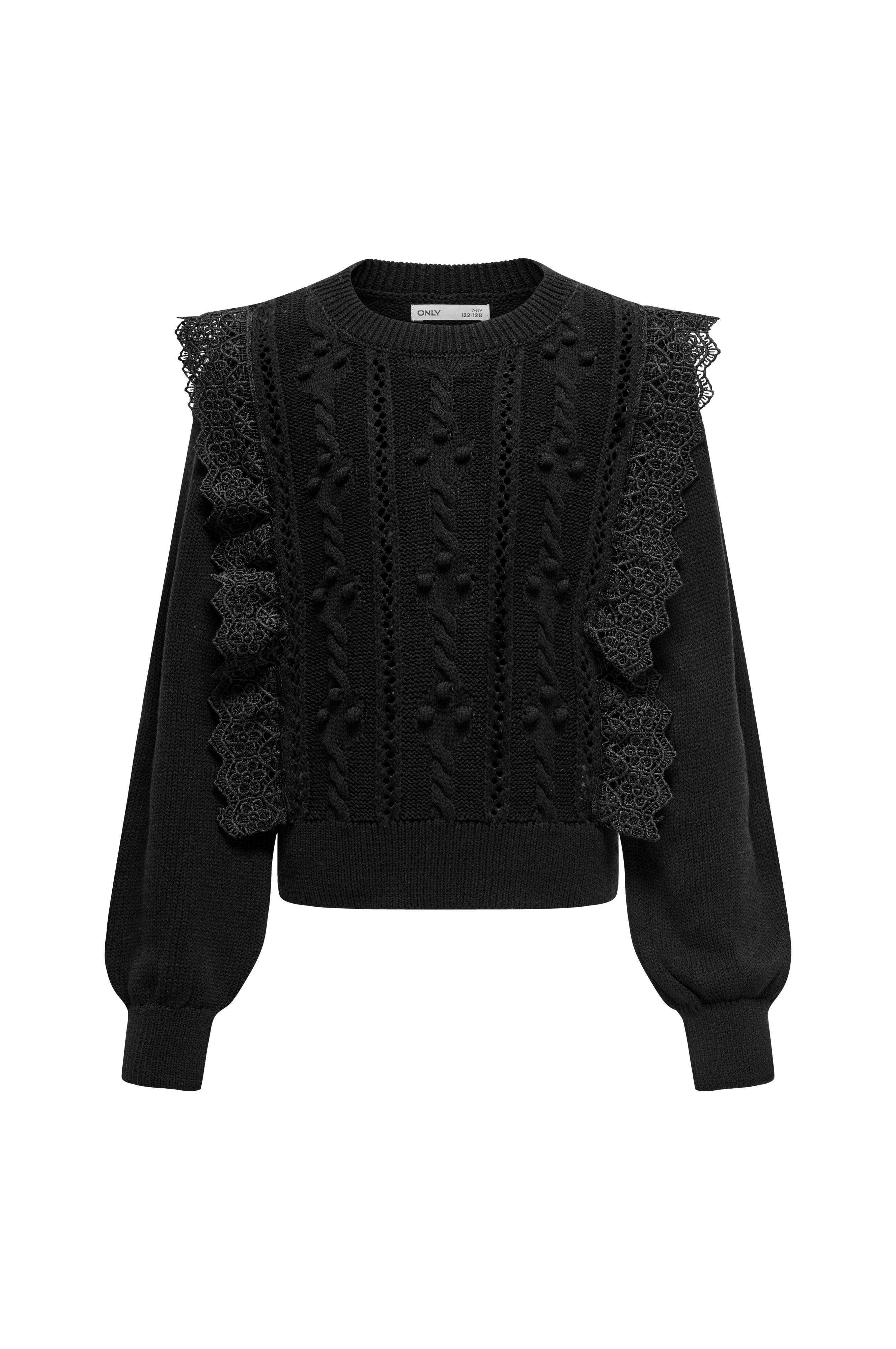 • Strikket trøje med kabelstrikning og hulmønster foran• Blondevolanter foran og omkring skuldrene• Lange ærmer• Ribmanchetter ved manchetterne og nederst