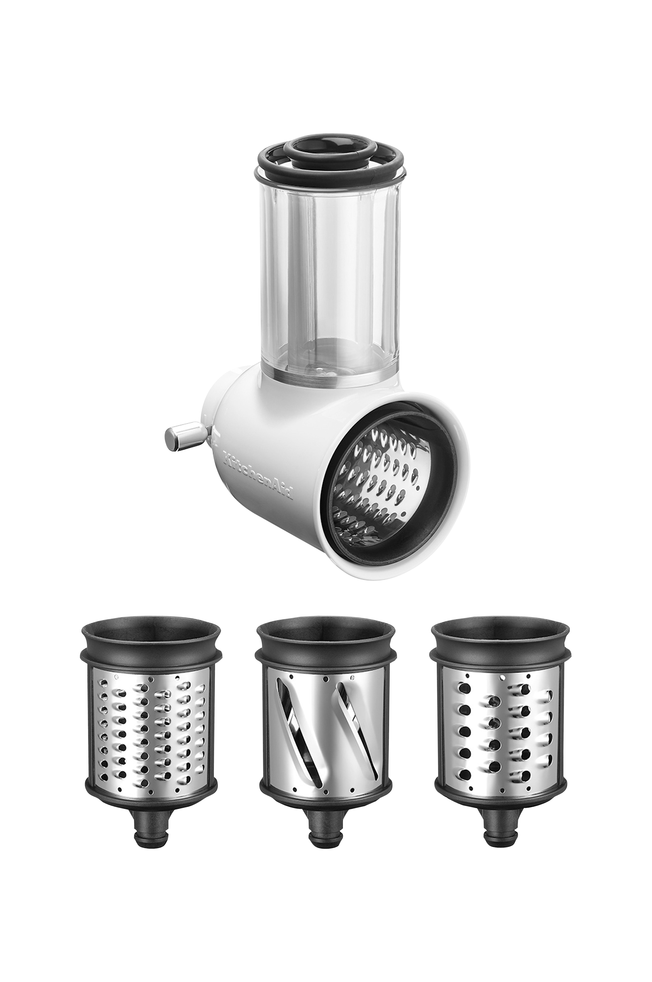 Tre forskellige dele i rustfrit stål som hurtigt kan skiftes ud medfølger til skiveskæring (3 mm), grove strimler (6 mm) og mellemgrove strimler (4 mm).