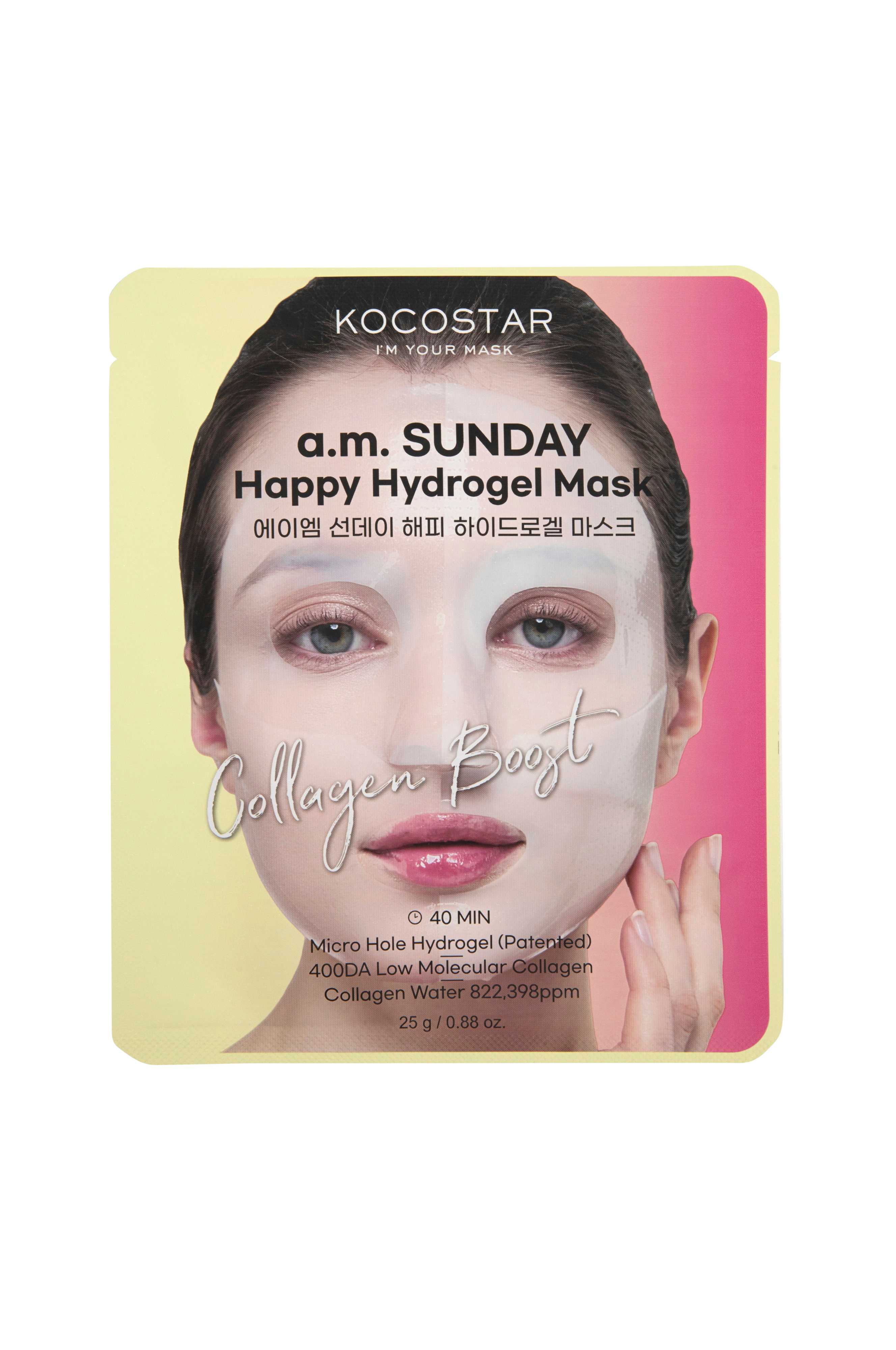 a.m. Sunday Happy Hydrogel Mask er en opstrammende hydrogelmaske, der hjælper med at fremme en sund, smidig og glødende hud samt fugter og lysner teinten. Indeholder kollagenvand og lavmolekylært kollagenekstrakt, som trænger dybt ind i huden og giver mærkbare resultater. Indeholder også andre kraftfulde ingredienser som niacinamid, adenosin, hyaluronsyre, E-vitamin og allantoin.