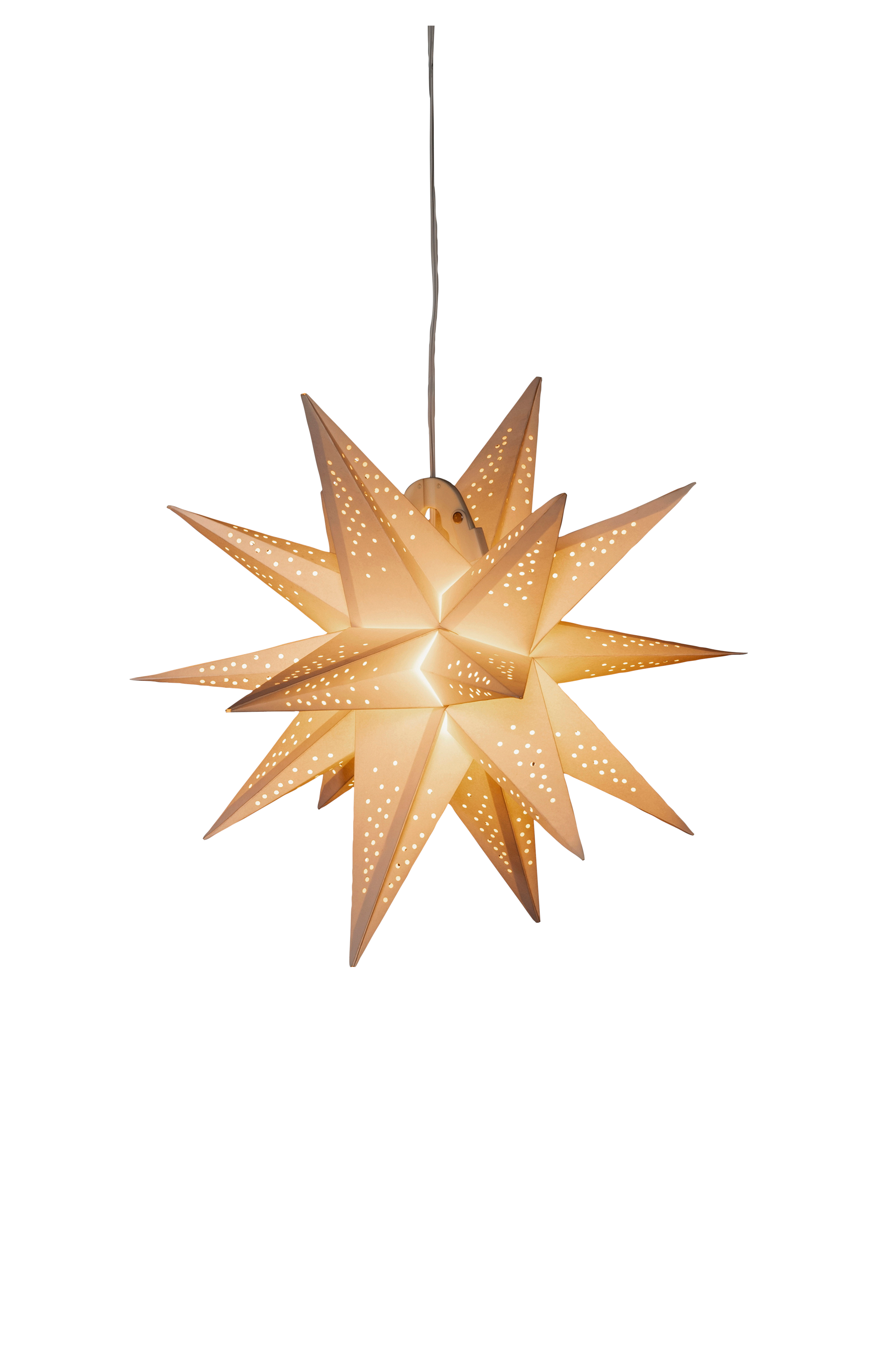 3D papirstjerne i hvid til udendørs brug med varm hvid LED. Inklusive transformator med indbygget dæmper. Pære medfølger ikke. Tilslutningsledningen er 5 m. Højde 45 cm