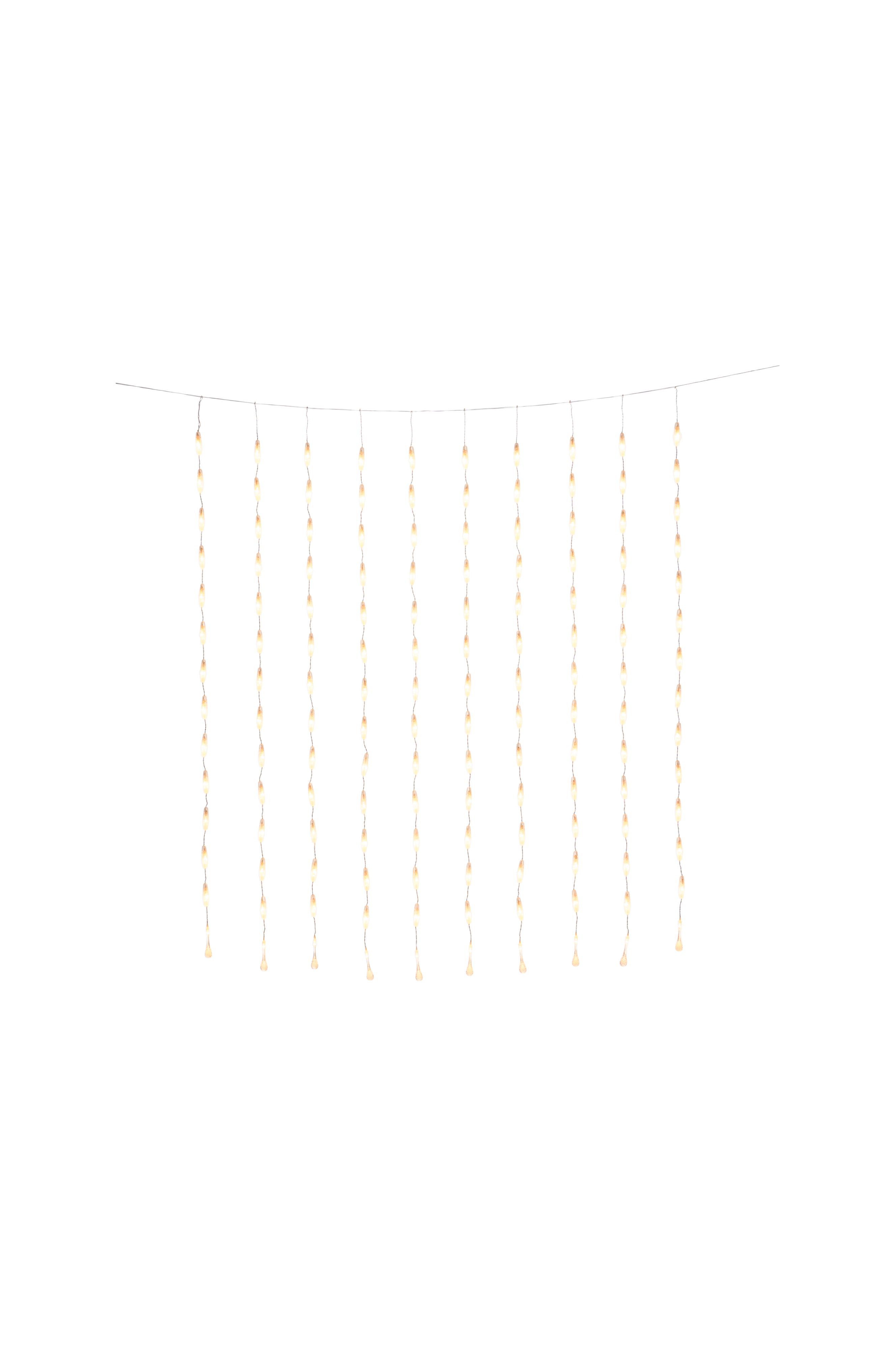 Lysgardin med dråber og 140 varmt hvide LED-pærer til udendørs brug. Drives med en 30 V transformer. Tilslutningskabel 5 meter. Højde 140 cm, bredde 120 cm.
