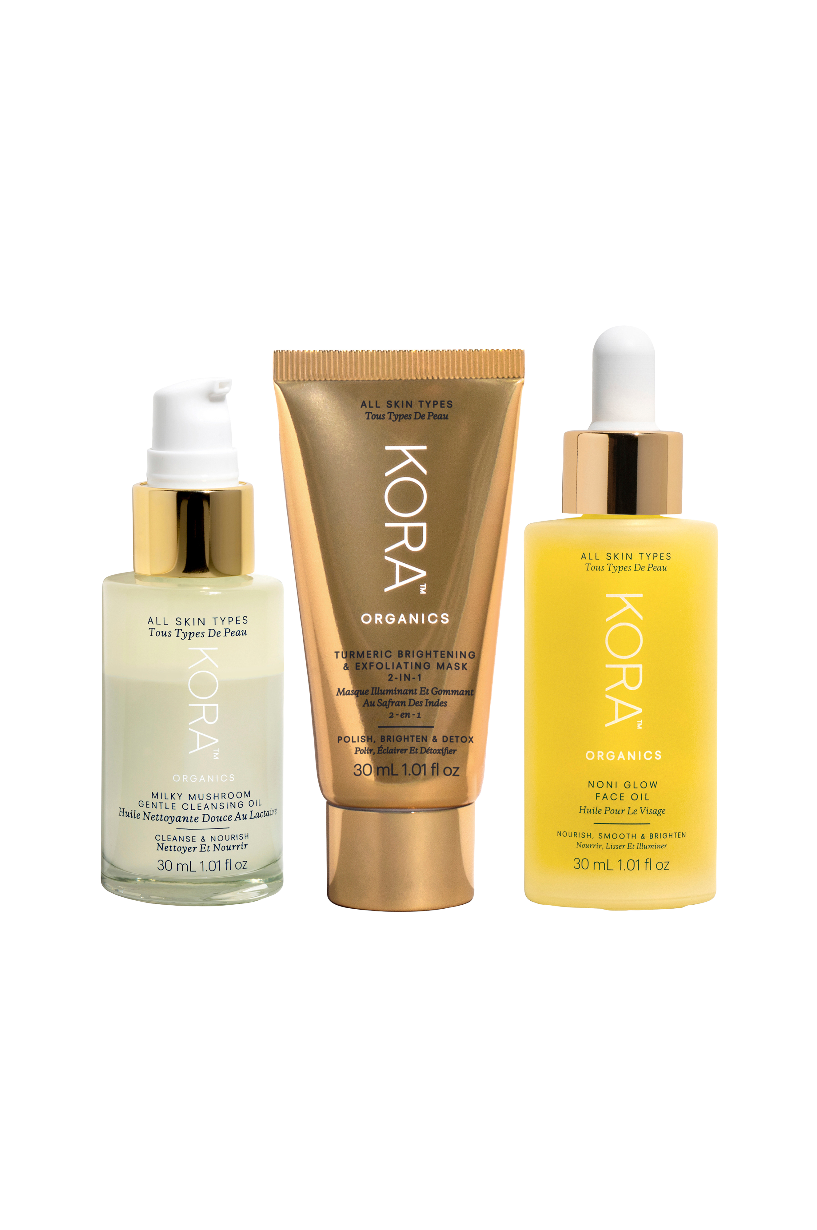 Dette sæt med tre certificerede økologiske favoritter får dig til at stråle på farten. Rens, afgift og plej din hud skånsomt med denne trio, der er drevet af antioxidantrig nonifrugt.