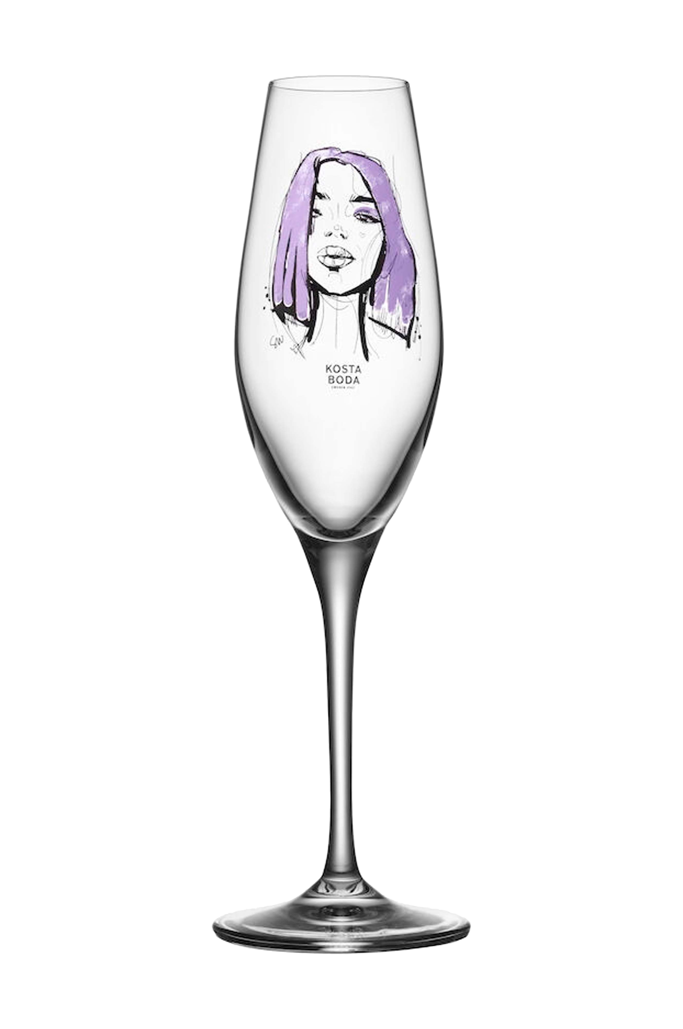 Champagneglassene i All About You-serien fra Kosta Boda handler om kærlighed, længsel og passion - stærke følelser fanget i glas med et nøjsomt design og illustrerede motiver med påvirkninger fra modeverden. Glasset Forever Mine er lys lilla, en farve valgt til at symbolisere glæde.