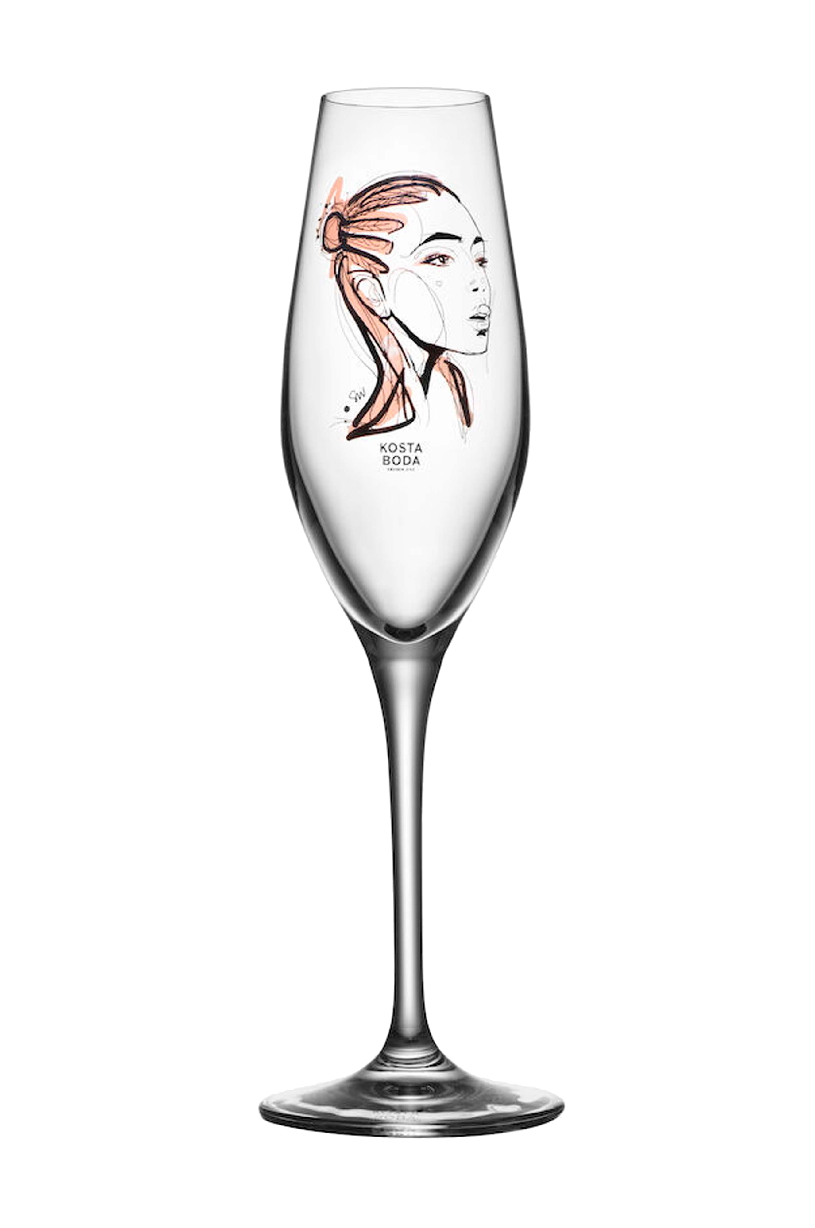 Champagneglassene i All About You-serien fra Kosta Boda handler om kærlighed, længsel og passion - stærke følelser fanget i glas med et nøjsomt design og illustrerede motiver med påvirkninger fra modeverden. Glasset Forever Yours har farven "dusty pink", som her symboliserer romantik.