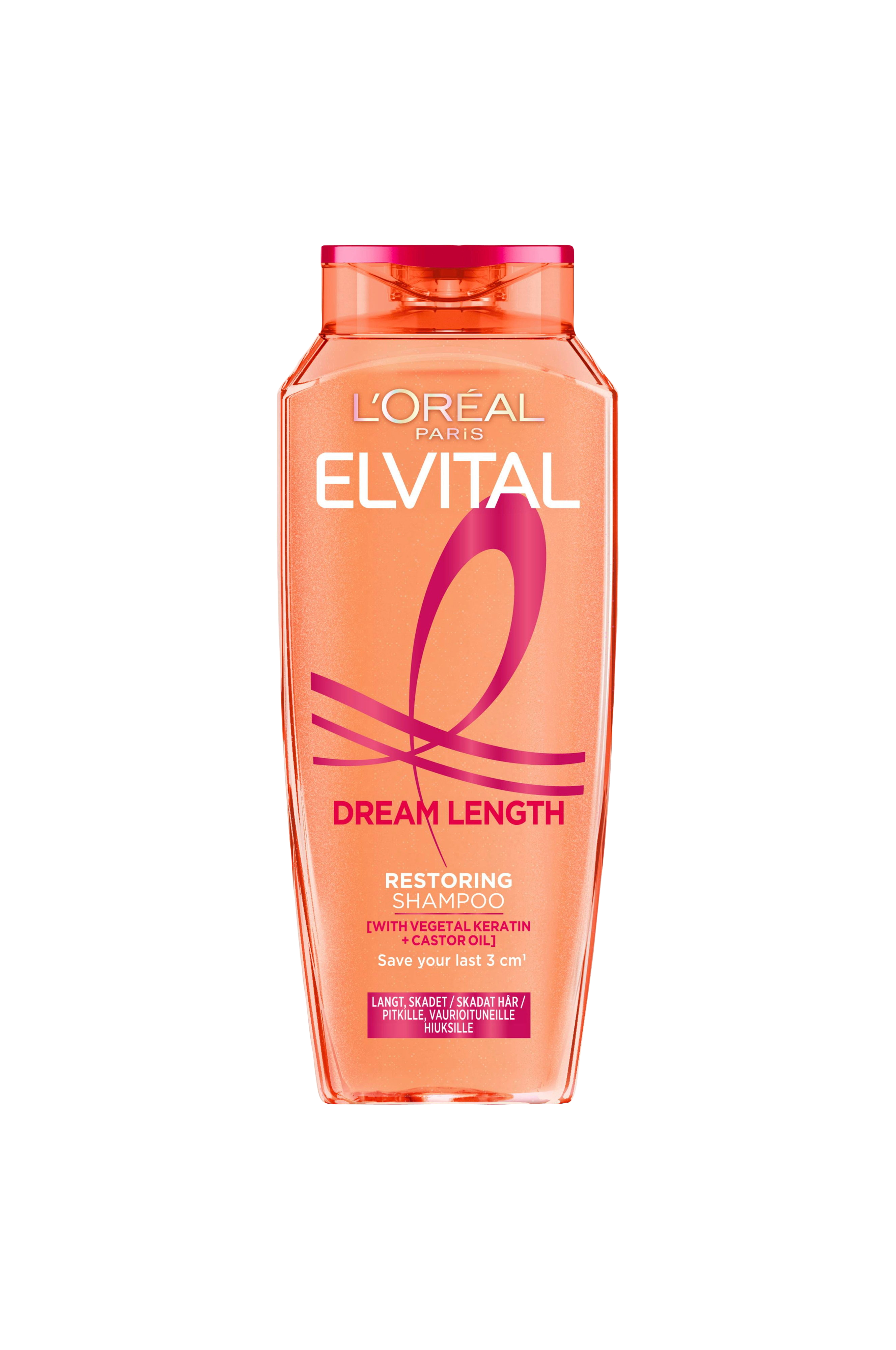 L'Oréal Paris Elvital Dream Length Shampoo er en genopbyggende shampoo til langt og skadet hår. Med en plejende formel som intenst reparerer længderne og er beriget med vegetabilsk keratin, vitaminer og ricinolie. Ikke flere tynde, spaltede spidser - kun langt, glansfuldt hår som føles næret og stærkere*.