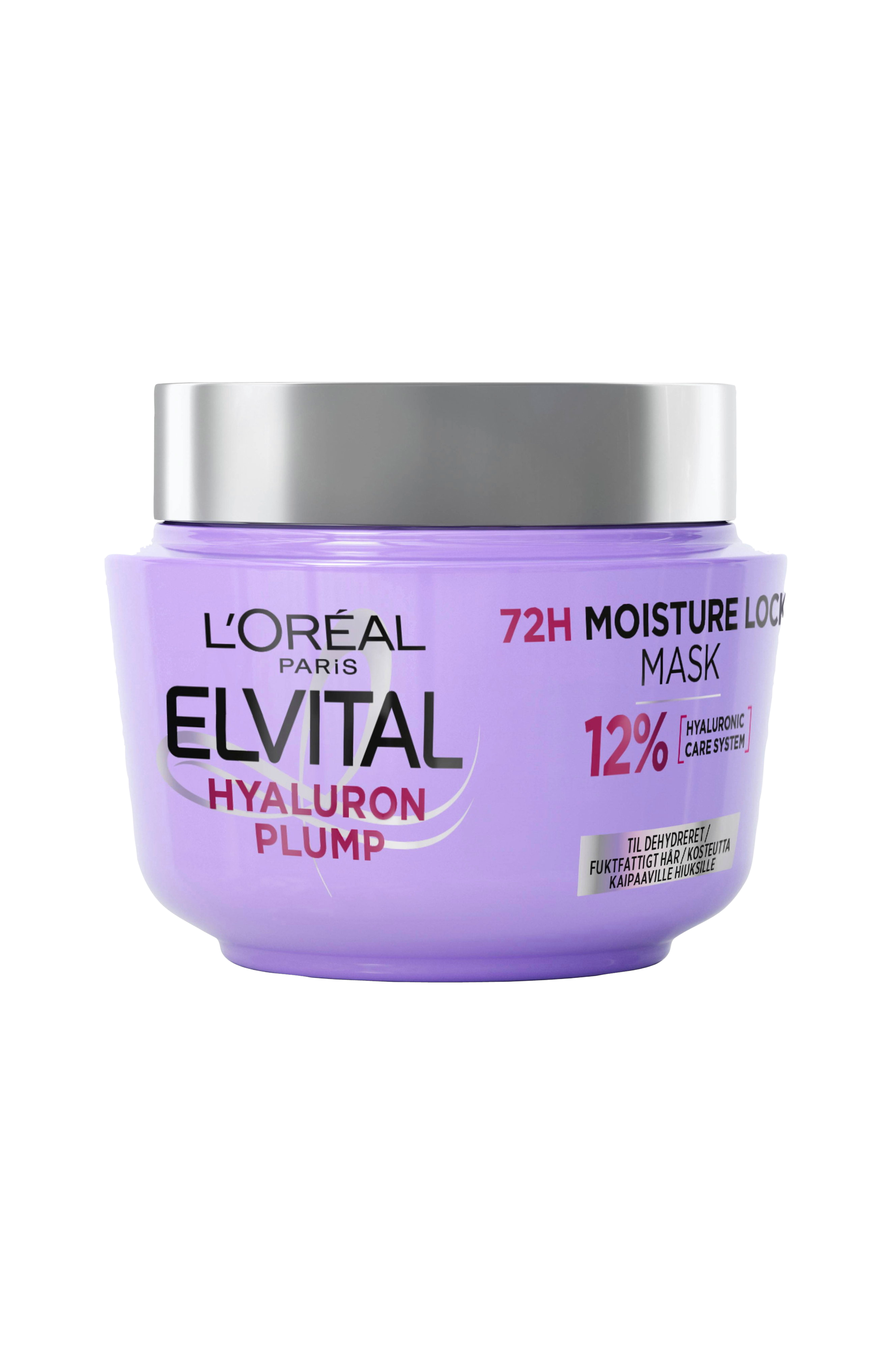 L'Oréal Paris Elvital Hyaluron Plump 72H* Moisture Wrapping Mask for dehydreret hår er beriget med hyaluronsyre. Dette molekyle som findes naturligt i kroppen, absorberer 1000 gange sin egen vægt i vand og hjælper med at give fyldigt hår.