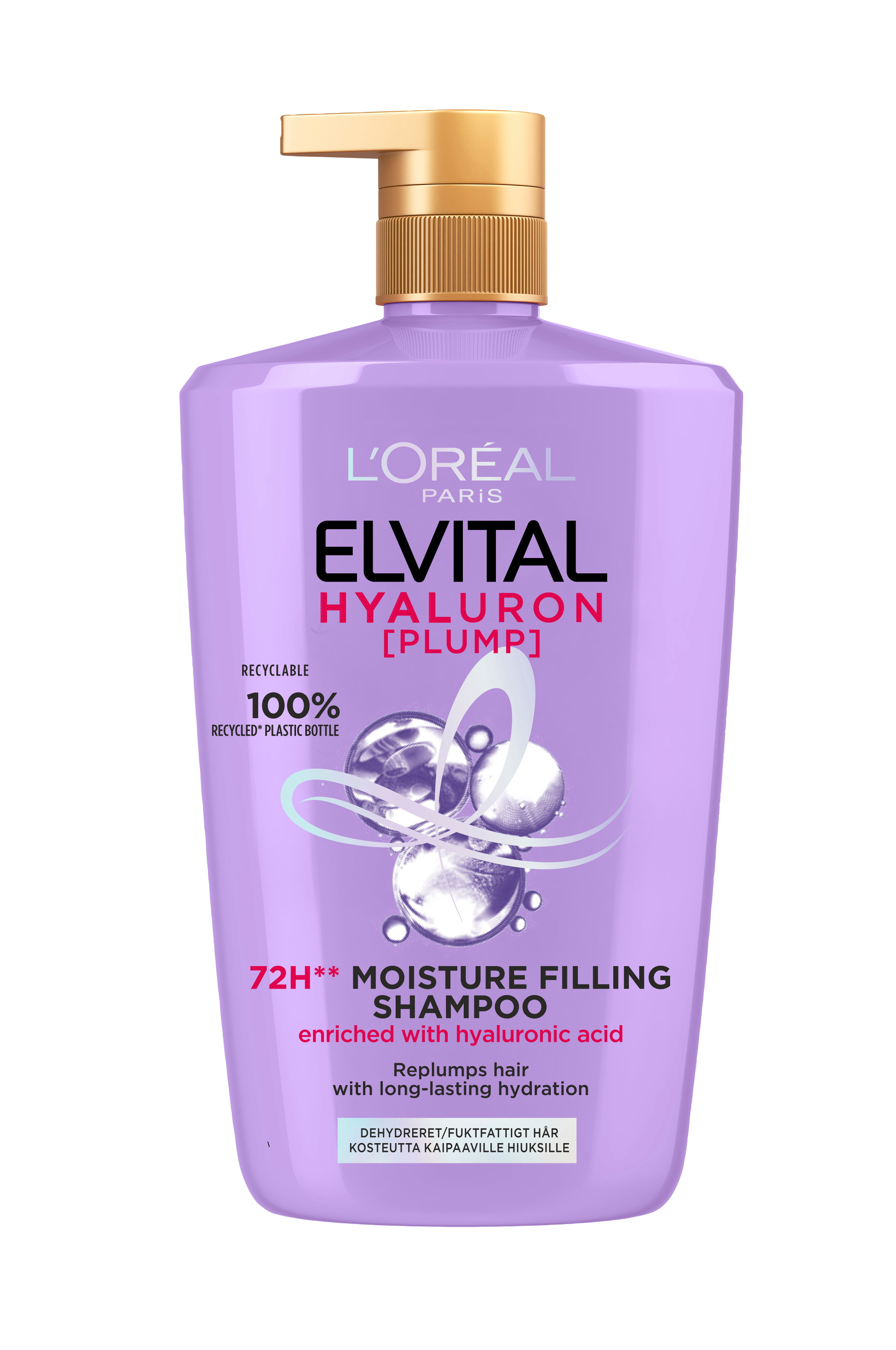 L'Oréal Paris Elvital Hyaluron Plump shampoo er en shampoo til dehydreret hår. Formlen er beriget med hyaluronsyre og fylder dit hår med fugt i 72 timer*. Resultatet er fyldigere hår som er 10x mere fugtet*. Opdag hele rutinen: Shampoo + balsam + lamellar water + maske + serum.