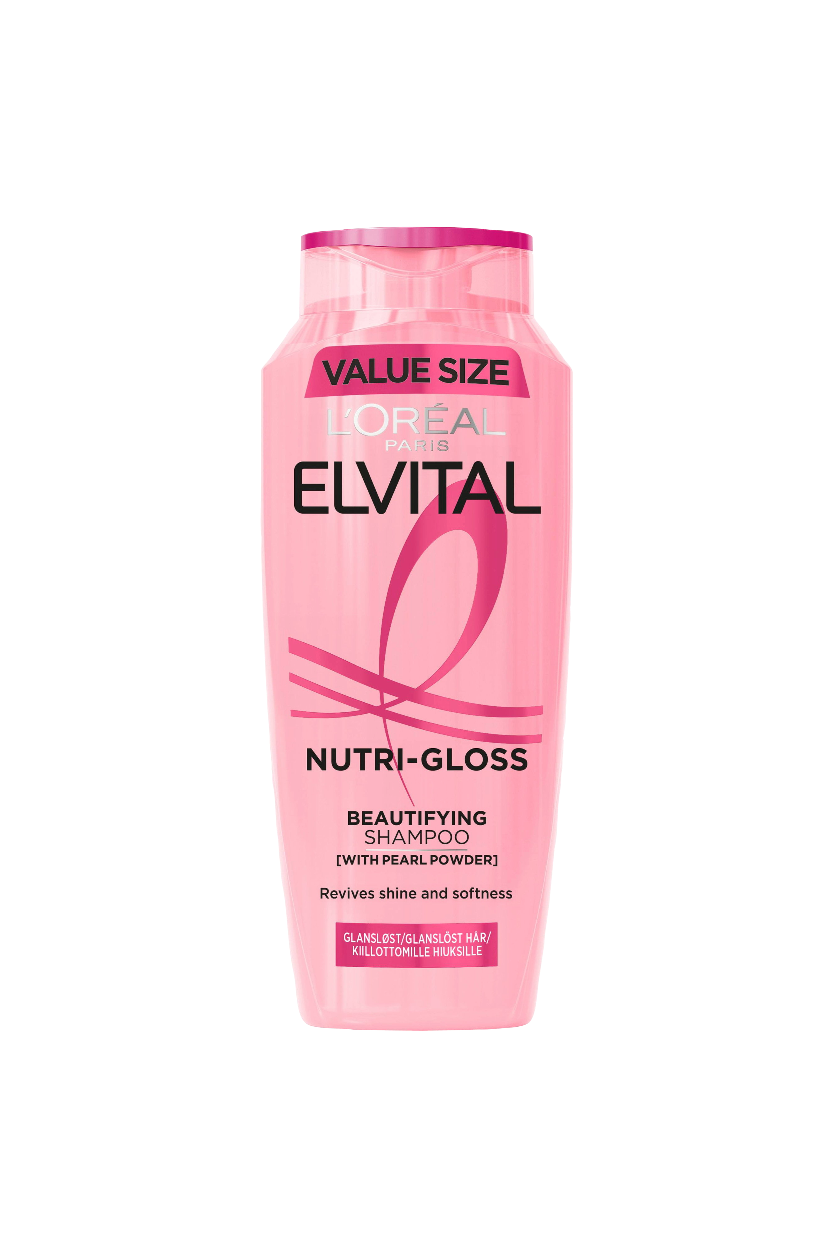 L'Oréal Paris Elvital Nutri Gloss shampoo er den perfekte shampoo til dig hvis dit hår mangler glans. Formlen er beriget med perlemor for en fantastisk glans og nærer hårets fibre, så håret bliver silkeblødt.