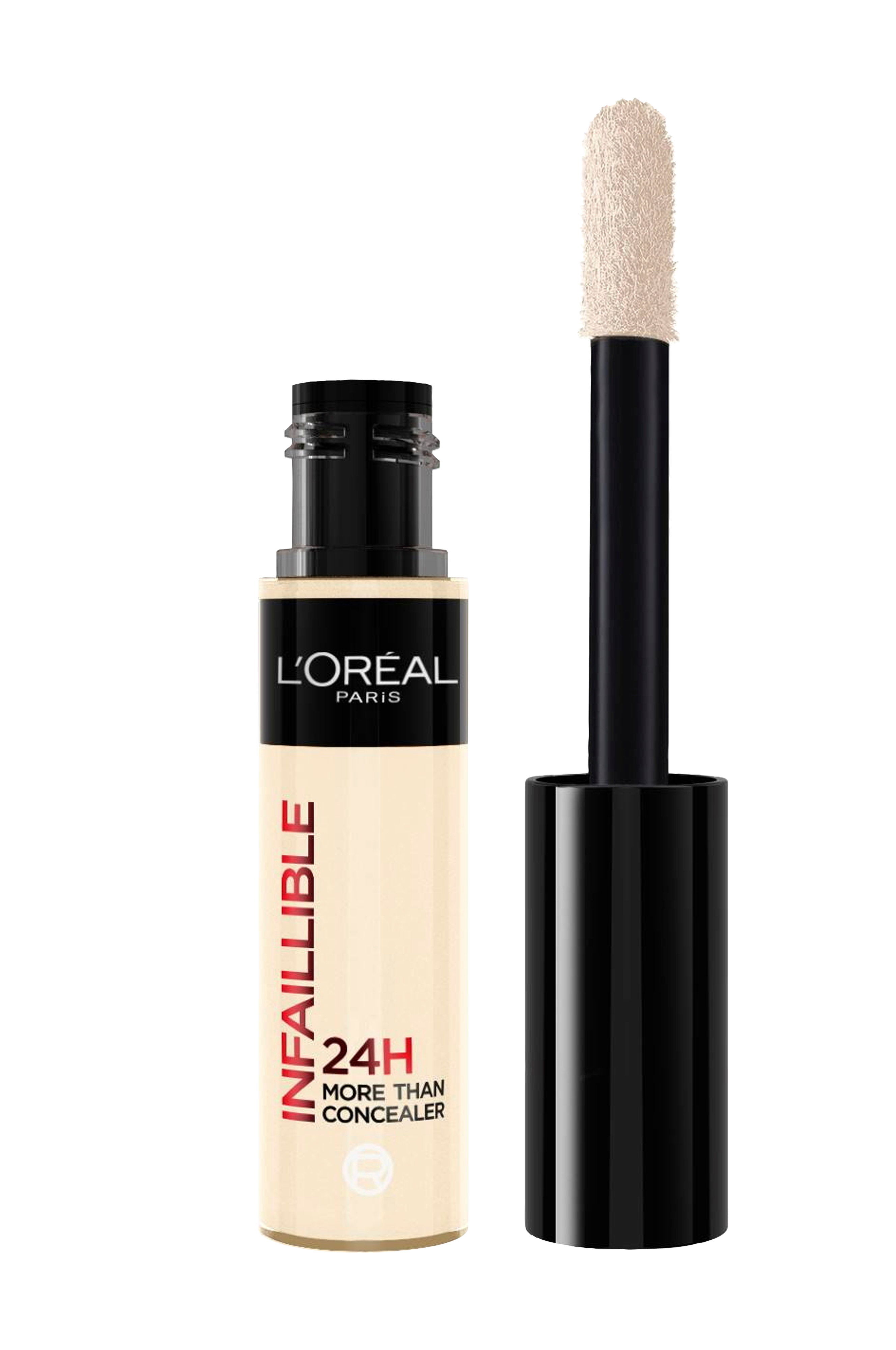 L'Oréal Paris Infaillible More Than a Concealer er en heldækkende concealer, som holder i 24 timer og føles let. Formlen har et højt indhold af pigmenter for maksimal dækkeevne og en blanding af olier for en behagelig og nem påføring samt fugt. Bliver siddende hele dagen uden at klumpe eller sætte sig i fine linjer. Supersize applikator gør det nemt at påføre concealeren på både målrettede eller større områder.