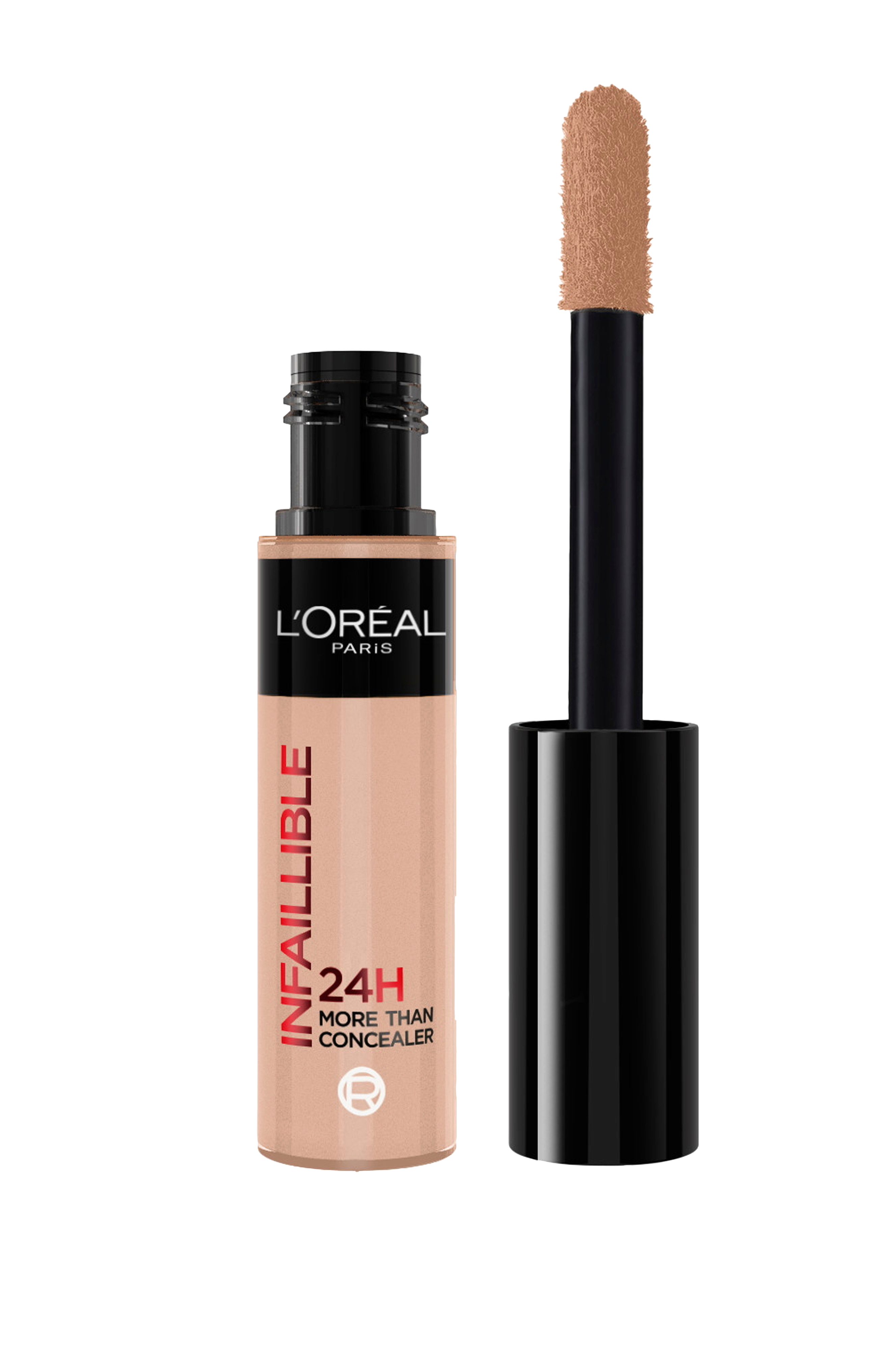L'Oréal Paris Infaillible More Than a Concealer er en heldækkende concealer, som holder i 24 timer og føles let. Formlen har et højt indhold af pigmenter for maksimal dækkeevne og en blanding af olier for en behagelig og nem påføring samt fugt. Bliver siddende hele dagen uden at klumpe eller sætte sig i fine linjer. Supersize applikator gør det nemt at påføre concealeren på både målrettede eller større områder.