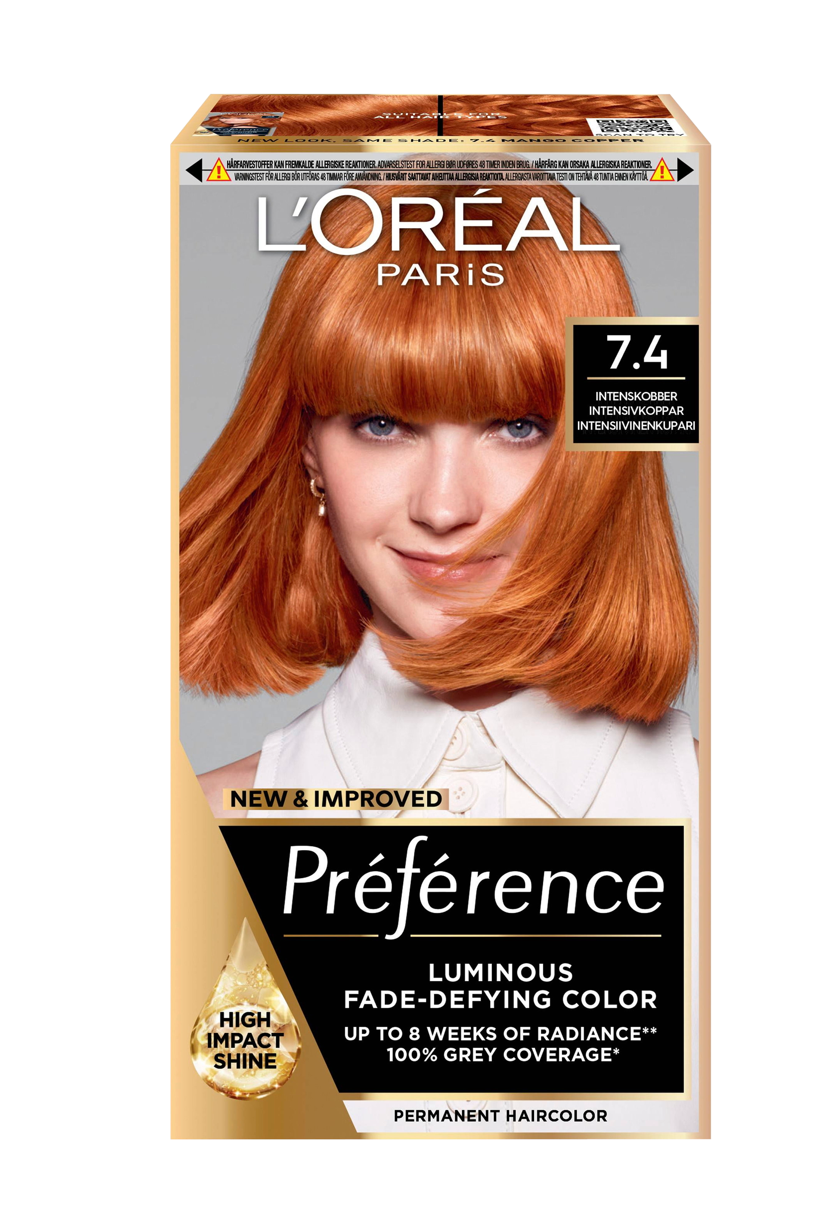 L'Oréal Paris Préférence 7,4 Mango Copper er en permanent hårfarge som passer til alle hårtyper og gir et skinnende blankt resultat. Formelen gir en strålende farge med fantastisk glans som bevares i opptil 8 uker**. Dekker grå hår 100 %.