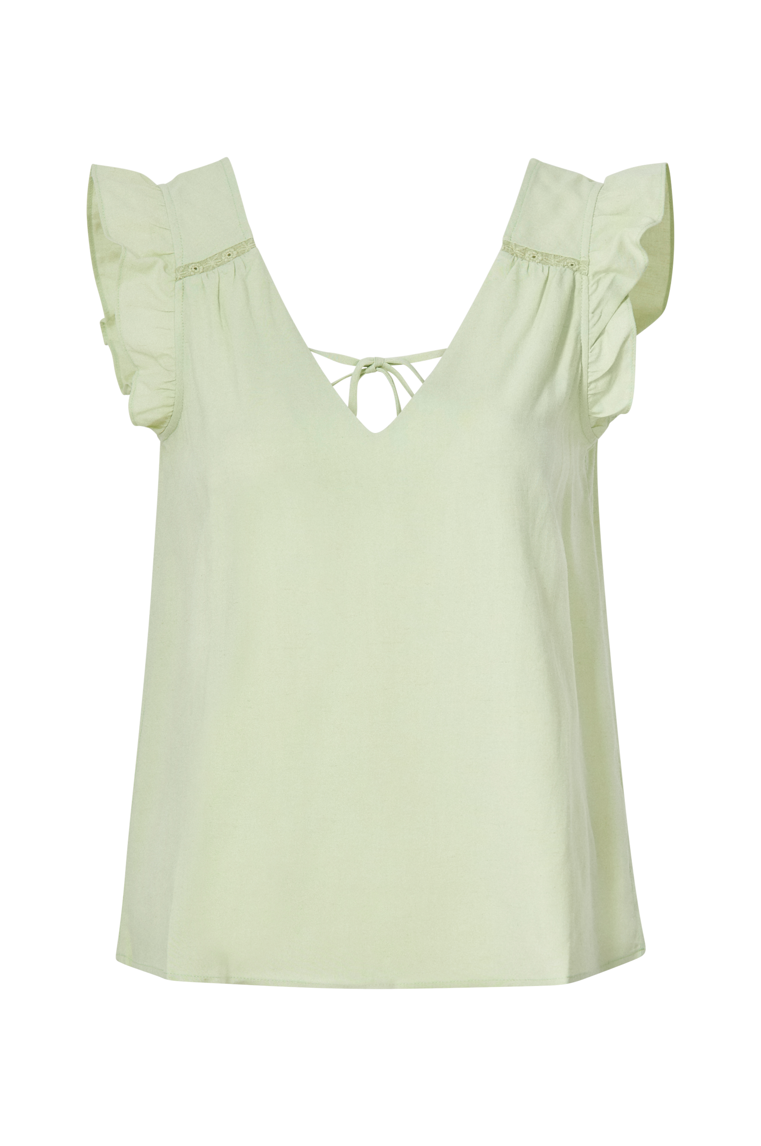 Bluse med flæse i ærmegabene og dyb udskæring bagpå. Romantisk model i behageligt blandingsmateriale af viskose/hør. Detaljer - Ærmeløs model - Lige model - V-udskæring foran og bagpå - Længde 62 cm i str. M Materiale og vaskeanvisning - 80% viskose, 20% hør - Finvask 30° - Stryges ved lav temperatur/tåler ikke blegemiddel - Tåler ikke tørretumbling - Tåler ikke kemisk rens