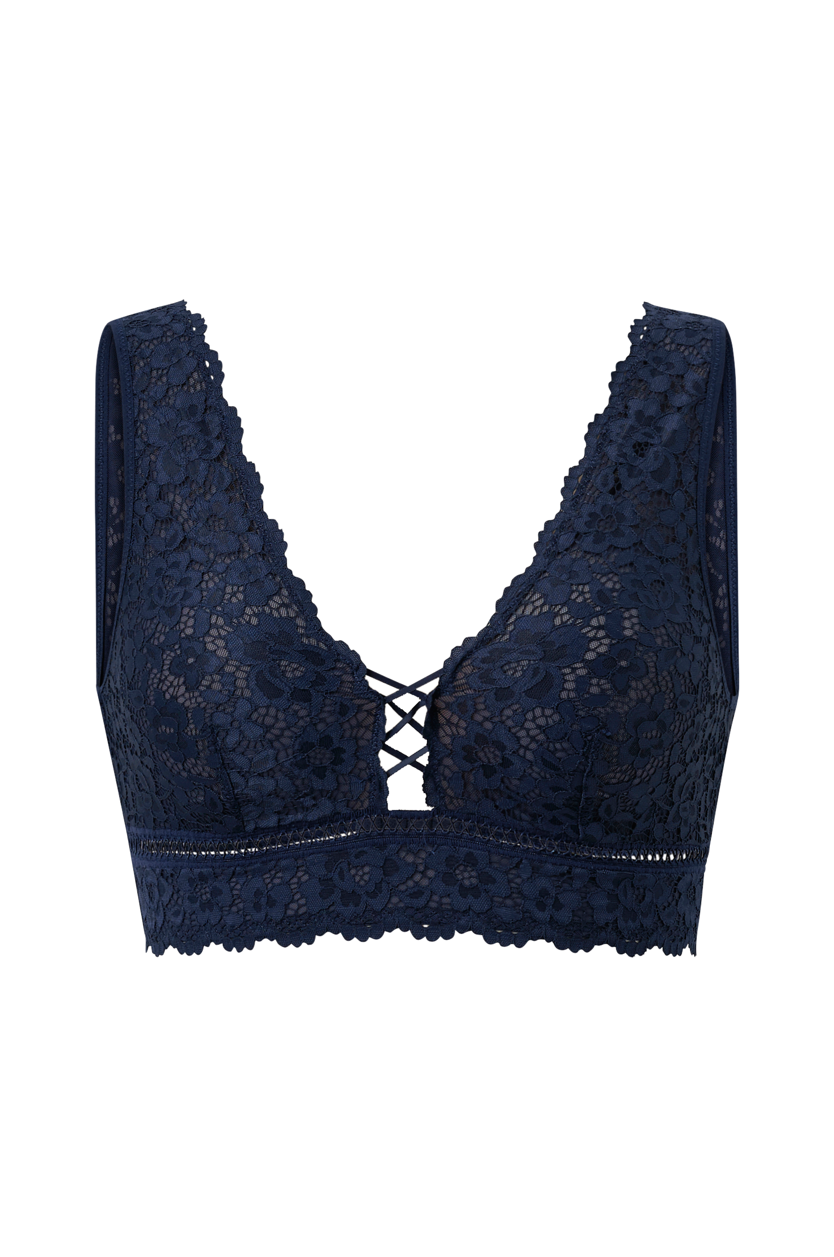 Bh-top i trekantsmodel uden bøjle. Smuk blonde og snøre mellem skålene. Dekorativ elastik under brystet. Detaljer - Trekantsmodel - Uden vattering - Blonde - Uden bøjle Materiale og vaskeanvisning - Primært materiale: 94% polyamid, 6% elastan - For i skålene: 90% polyamid, 10% elastan - Finvask 30° - Tåler ikke strygning/tåler ikke blegemiddel - Tåler ikke tørretumbling - Tåler ikke kemisk rens