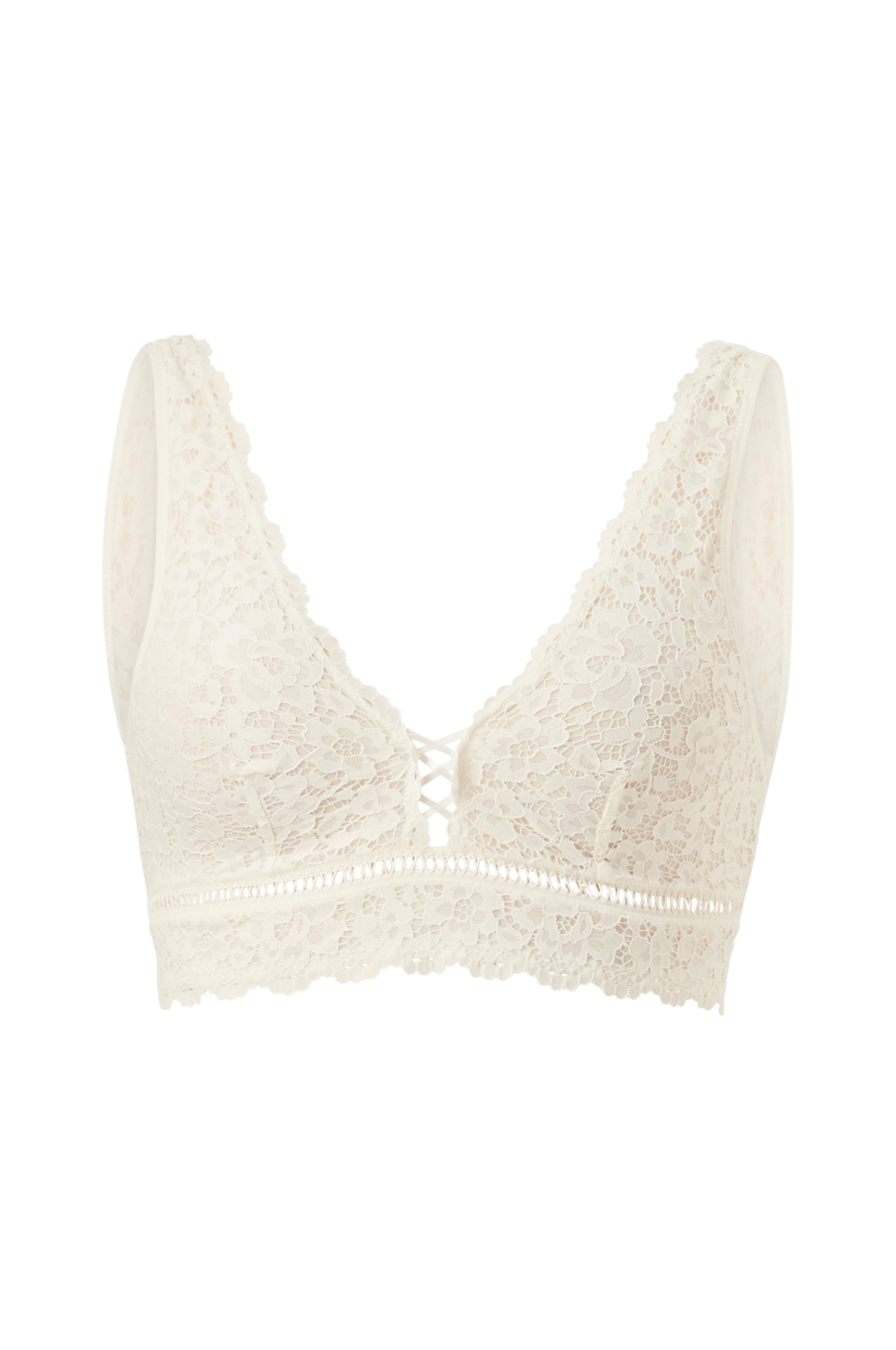 Bh-top i trekantsmodel uden bøjle. Smuk blonde og snøre mellem skålene. Dekorativ elastik under brystet. Detaljer - Trekantsmodel - Uden vattering - Blonde - Uden bøjle Materiale og vaskeanvisning - Primært materiale: 94% polyamid, 6% elastan - For i skålene: 90% polyamid, 10% elastan - Finvask 30° - Tåler ikke strygning/tåler ikke blegemiddel - Tåler ikke tørretumbling - Tåler ikke kemisk rens