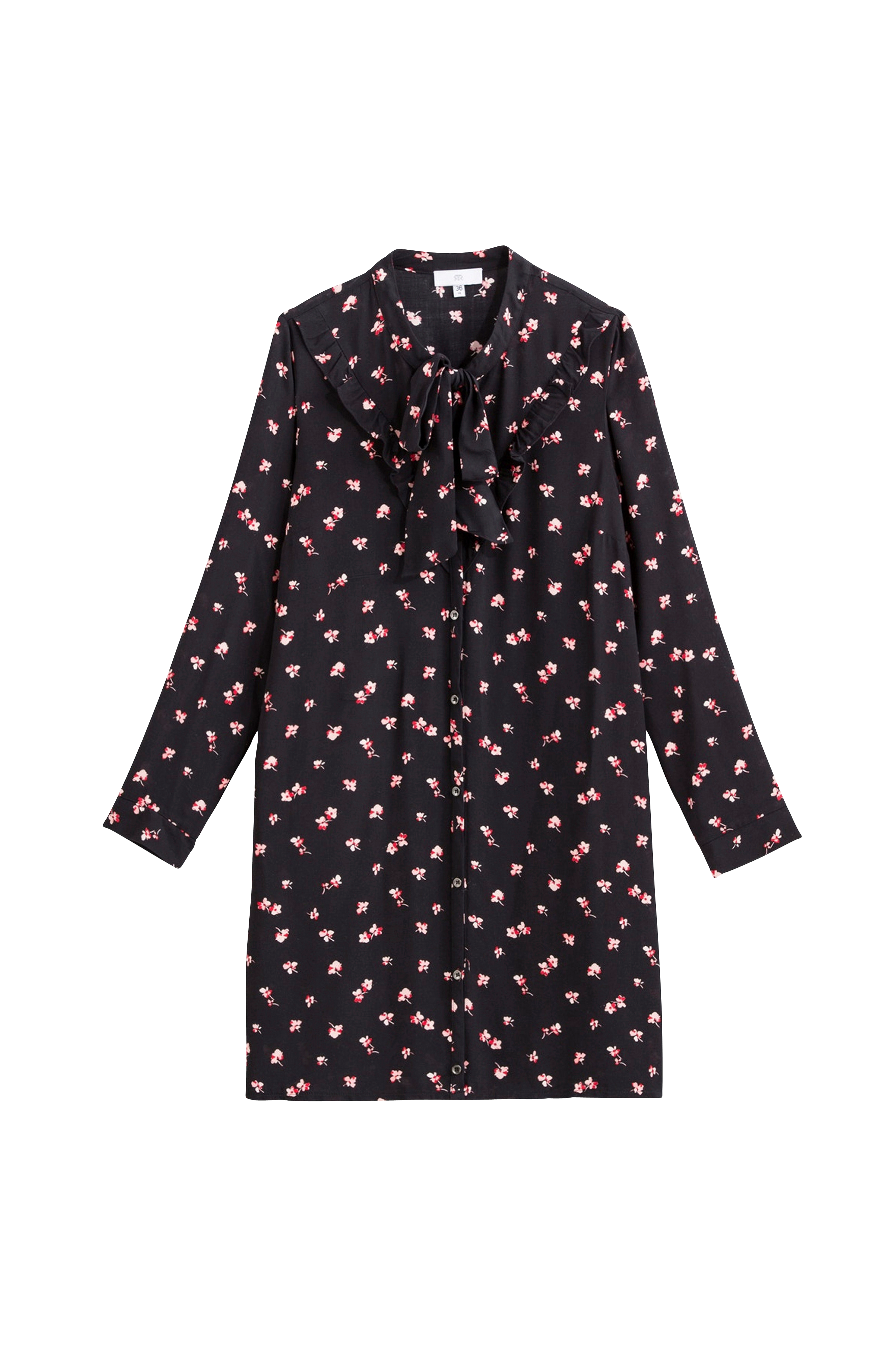 Kort kjole i let materiale med fint fald. Feminin model med smukke detaljer. Bindebånd i halsudskæringen og påsyede flæser. Detaljer - Lige model - Kort model - Langt ærme - Bindebånd i halsudskæring - Blomstermønster Materiale og vaskeanvisning - 100% viskose - Finvask 30° - Stryges ved middeltemperatur/tåler ikke blegemiddel - Tåler ikke tørretumbling - Tåler ikke kemisk rens Yderligere information - Påsyede flæser foran - Knapper foran og i ærmekanten - Længde 90 cm i str. 38