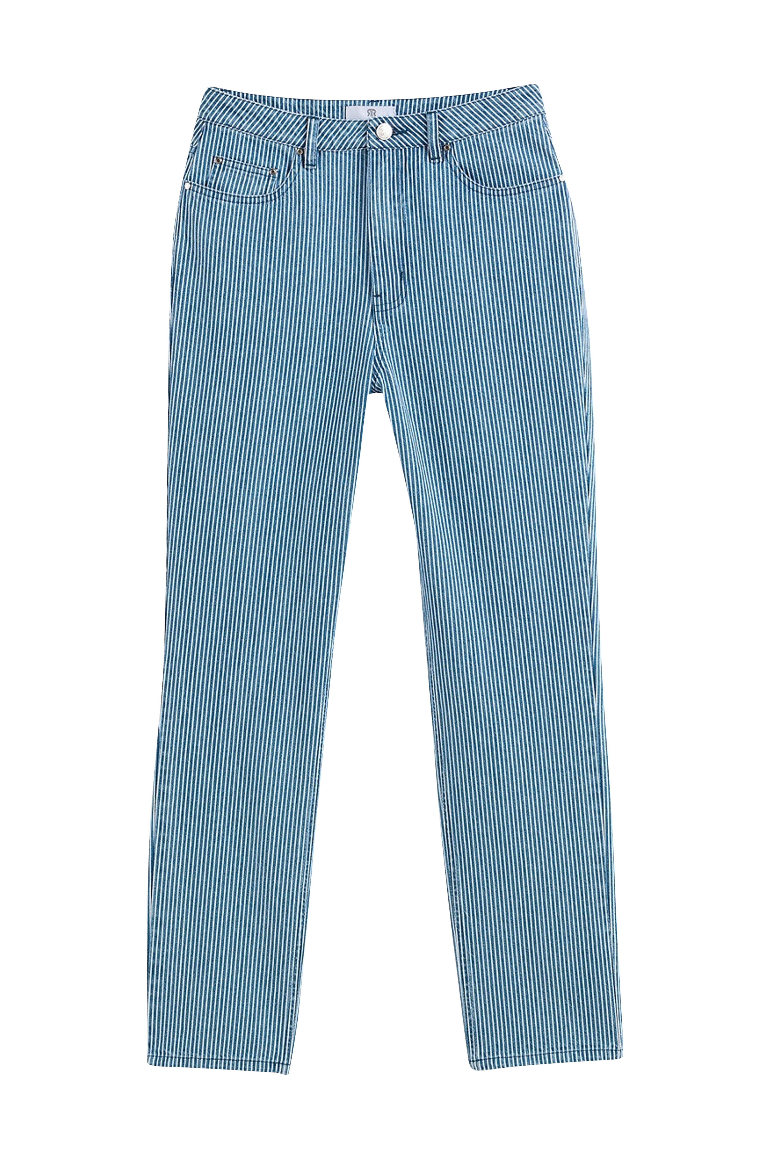 90'er-inspirerede bukser i mom-model. Flot retrostil. Detaljer - Smal model - 5-lommemodel - Normalhøj talje - Stribet mønster - Benlængde 67 cm, vidde forneden 18,5 cm i str. 38 Materiale og vaskeanvisning - 100% bomuld - Finvask 30° - Stryges ved middeltemperatur/tåler ikke blegemiddel - Tåler ikke tørretumbling - Tåler ikke kemisk rens