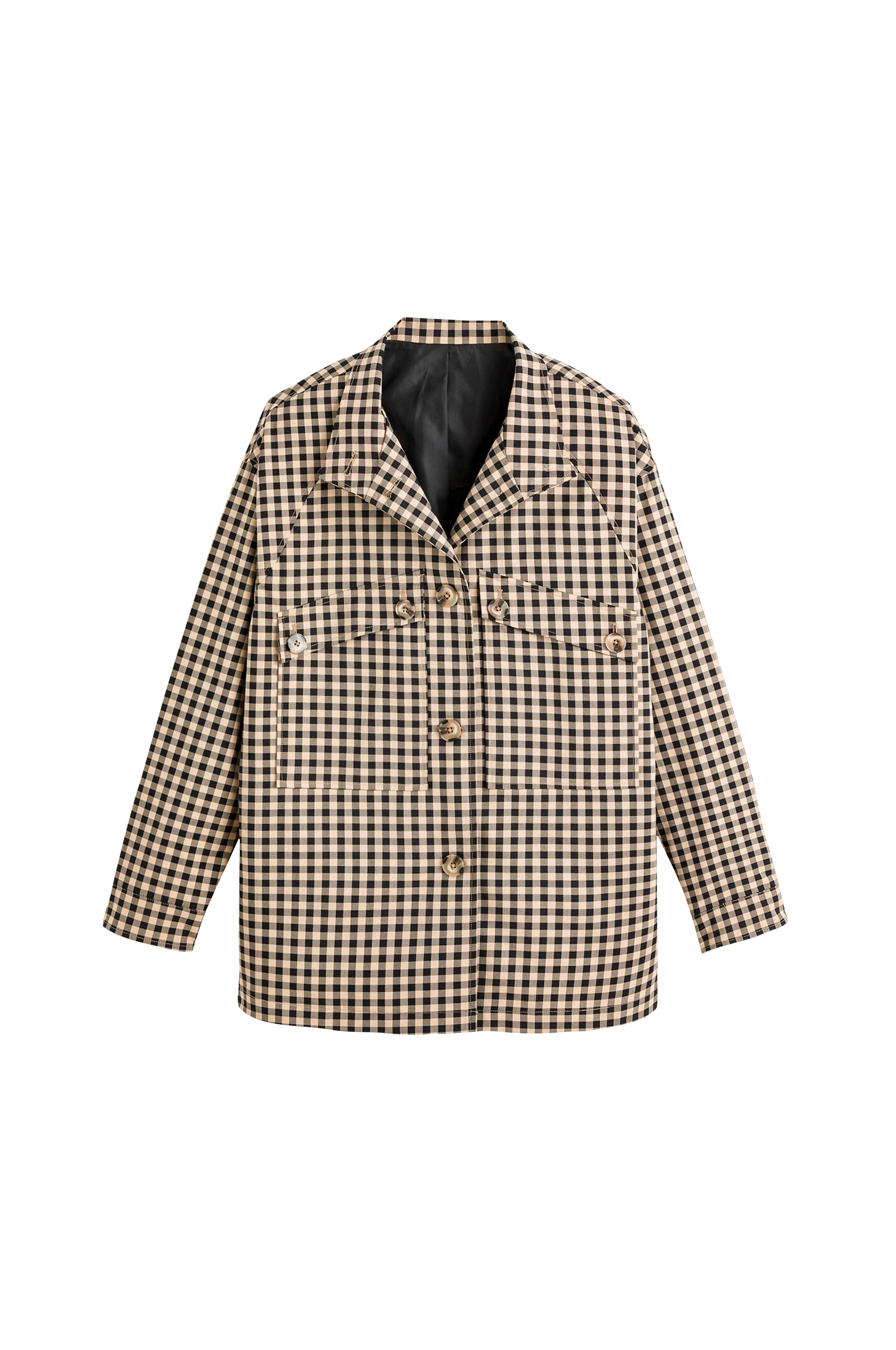 Vindjakke med trendy tern. To praktiske lommer. Alsidig jakke i elegant stil. Detaljer - Halvlang model - Standkrave - Småternet mønster - Lukning foran - 2 lommer med klap og knap foran - Langt ærme med manchet og knap - Længde 74 cm i str. 38 Materiale og vaskeanvisning - Primært materiale: 54% bomuld, 44% polyester, 2% elastan - For: 100% polyester - Finvask 30° - Stryges ved lav temperatur/tåler ikke blegemiddel - Tåler ikke tørretumbling - Tåler ikke kemisk rens